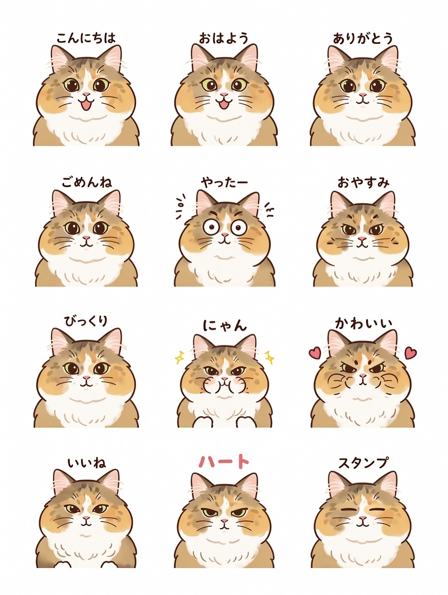 Using the cat character in this attached image, please create a list image depicting 12 types of LINE stickers. Please create 12 types of sticker illustrations, each set with text.