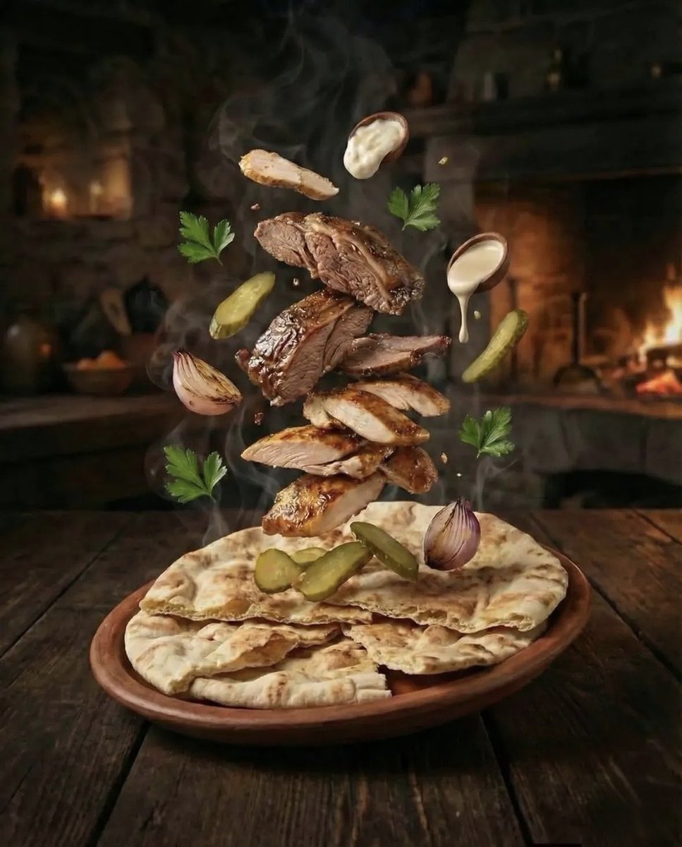 { "image_prompt": { "theme": "Hyper-realistic cinematic food photography of deconstructed Middle Eastern cuisine", "composition_style": "Levitating/Floating elements, exploded view", "scenes": [ { "dish": "Deconstructed Shawarma", "floating_elements": [ "Slices of seasoned grilled meat", "Pickles", "Red onion wedges", "Fresh parsley leaves", "Small ceramic bowls of white garlic sauce and tahini" ], "dynamic_actions": "Drop of sauce falling from bowl, soft steam rising from meat", "base_elements": "Rustic wooden plate with warm flatbread", "background_environment": "Moody, dark rustic kitchen with a glowing fireplace" }, { "dish": "Deconstructed Jordanian Mansaf", "arrangement": "Vertical levitation layers", "layers": { "top": "Torn shrak bread", "middle": "Mound of yellow turmeric rice", "lower_middle": "Large chunks of tender cooked lamb", "bottom": "Dynamic splash of thick, creamy white jameed sauce" }, "garnish": "Toasted almonds, pine nuts, chopped parsley", "base_elements": "Shallow clay dish", "background_environment": "Rustic stone kitchen" } ], "lighting_and_atmosphere": { "type": "Cinematic lighting", "mood": "Warm, moody, dramatic, high contrast", "specifics": "Soft highlights, rich textures" }, "technical_specs": { "resolution": "8K", "camera_settings": "Shallow depth of field", "style": "Ultra-realistic commercial food photography" } } }{ "image_prompt": { "theme": "超现实电影级美食摄影,解构中东美食", "composition_style": "漂浮/悬空元素,爆炸图", "scenes": [ { "dish": "解构沙瓦玛", "floating_elements": [ "调味烤肉片", "腌菜", "红洋葱块", "新鲜欧芹叶", "盛有白色蒜酱和芝麻酱的小陶瓷碗" ], "dynamic_actions": "酱汁从碗中滴落,肉片冒出缕缕热气", "base_elements": "带有温热大饼的质朴木盘", "background_environment": "昏暗、质朴的厨房,壁炉散发着微光" }, { "dish": "解构约旦曼萨夫", "arrangement": "垂直悬浮分层", "layers": { "top": "撕碎的 shrak 面包", "middle": "一堆黄色姜黄饭", "lower_middle": "大块鲜嫩的熟羊肉", "bottom": "浓稠奶油状白色 jameed 酱的动态飞溅" }, "garnish": "烤杏仁、松子、切碎的欧芹", "base_elements": "浅口陶盘", "background_environment": "质朴的石砌厨房" } ], "lighting_and_atmosphere": { "type": "电影级灯光", "mood": "温暖、情绪化、戏剧性、高对比度", "specifics": "柔和高光,丰富纹理" }, "technical_specs": { "resolution": "8K", "camera_settings": "浅景深", "style": "超现实商业美食摄影" } } }