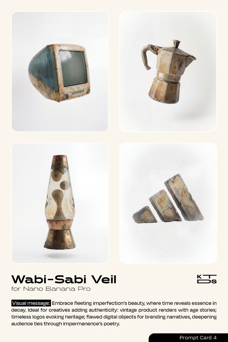 { "name": "Wabi-Sabi Veil", "type": "image", "description": "A subtle, imperfectly aged and weathered effect applied to the [OBJECT/PRODUCT/LOGO], embodying the Wabi-Sabi philosophy of finding beauty in imperfection, transience, asymmetry, and natural decay. The surface shows gentle patina with faint cracks that add character like a cherished cracked bowl, subtle discoloration from time's touch revealing proof of life, irregular textures like hand-thrown pottery with uneven glazing that's interesting rather than flawed, soft erosion at edges as if worn by wind and water evoking well-loved wear, minimalist simplicity with organic irregularities, muted natural imperfections such as tiny fissures filled with faint moss-like accents or tea-stain blooms that highlight resilience, and a sense of quiet humility in the object's form, levitating freely in space to highlight its humble beauty without distraction, rejecting polished perfection for memorable authenticity.", "negative_description": "No glossy perfection, no symmetrical precision, no vibrant artificial colors, no modern sleekness or polished chrome, avoid uniform textures, no digital sharpness or CGI smoothness, no ornate decorations or complexity, no bright highlights or harsh contrasts, no futuristic or mechanical elements, no cartoonish exaggeration, no heavy decay or broken appearance, no hidden cracks or over-polished surfaces.", "style": "In the authentic Japanese Wabi-Sabi aesthetic, blending the rustic simplicity of traditional tea ceremony ceramics with the aged elegance of Zen garden stones, hyper-realistic digital rendering mimicking ancient craftsmanship by artists like Isamu Noguchi or Tadao Ando, with subtle influences from organic minimalism and imperfection-focused photography akin to Hiroshi Sugimoto's serene seascapes.", "composition": "Centered asymmetrical floating composition in a soft three-quarter view to emphasize natural irregularities and volumetric depth, with the object occupying central focus but offset slightly for organic imbalance, generous white negative space surrounding to evoke solitude and introspection, rule of thirds placing key imperfections like cracks or patina blooms at intersection points for subtle visual poetry.", "camera_settings": { "lens": "50mm prime lens for natural perspective and intimate detail capture without distortion.", "aperture": "f/5.6 for balanced depth of field, keeping subtle textures in focus while allowing gentle fall-off.", "shutter_speed": "1/125s to capture stillness with a hint of natural motion blur in any faint steam or dust motes.", "iso": "200 for subtle grain that enhances the aged, organic feel without excessive noise." }, "lighting": { "type": "Soft, diffused natural daylight with minimal contrast for humble illumination.", "direction": "Gentle overhead light mimicking overcast sky from above, with subtle side fill from left to soft{ "name": "侘寂之纱", "type": "image", "description": "为 [OBJECT/PRODUCT/LOGO] 施加一种微妙、不完美的陈旧和风化效果,体现侘寂(Wabi-Sabi)哲学,即在不完美、无常、不对称和自然衰败中发现美。表面呈现出柔和的铜绿,带有细微的裂纹,如同珍贵的裂纹碗般增添特色;时间的触碰留下微妙的褪色,揭示生命的印记;不规则的纹理,如同手工制作的陶器,釉面不均,引人入胜而非缺陷;边缘有轻微的侵蚀,仿佛被风和水磨损,唤起被珍爱的磨损感;极简的朴素中带有自然的无规律性;柔和的自然缺陷,例如充满微弱苔藓般点缀的细小裂缝,或茶渍般的斑点,凸显韧性;以及物体形态中一种安静的谦逊感,在空间中自由漂浮,突出其朴素之美而不受干扰,拒绝完美的抛光,追求令人难忘的真实性。", "negative_description": "没有光泽的完美,没有对称的精确,没有鲜艳的人造色彩,没有现代的流畅或抛光的铬,避免统一的纹理,没有数字锐度或 CGI 光滑度,没有华丽的装饰或复杂性,没有明亮的亮点或强烈对比,没有未来感或机械元素,没有卡通式夸张,没有严重的腐烂或破损外观,没有隐藏的裂缝或过度抛光的表面。", "style": " authentic Japanese Wabi-Sabi aesthetic(真实的日式侘寂美学),融合了传统茶道陶瓷的质朴简约与禅宗园林石头的古老优雅,超现实的数字渲染模仿了野口勇(Isamu Noguchi)或安藤忠雄(Tadao Ando)等艺术家的古老工艺,并 subtly influences from organic minimalism and imperfection-focused photography akin to Hiroshi Sugimoto's serene seascapes(微妙地融入了有机极简主义和以不完美为焦点的摄影风格,类似于杉本博司(Hiroshi Sugimoto)宁静的海景)。", "composition": "Centered asymmetrical floating composition in a soft three-quarter view to emphasize natural irregularities and volumetric depth(柔和的四分之三视角下的居中不对称浮动构图,以强调自然不规则性和体积深度),物体占据中心焦点,但略微偏移以营造有机的不平衡感,周围留有充足的白色负空间以唤起孤独和内省,三分法构图将裂纹或铜绿斑点等关键缺陷置于交汇点,以形成微妙的视觉诗意。", "camera_settings": { "lens": "50mm prime lens for natural perspective and intimate detail capture without distortion(50 毫米定焦镜头,用于自然视角和捕捉亲密细节,无失真)。", "aperture": "f/5.6 for balanced depth of field, keeping subtle textures in focus while allowing gentle fall-off(f/5.6 光圈,用于平衡景深,使微妙的纹理保持清晰,同时允许柔和的虚化)。", "shutter_speed": "1/125s to capture stillness with a hint of natural motion blur in any faint steam or dust motes(1/125 秒快门速度,捕捉静止,同时在任何微弱的蒸汽或尘埃中带有一丝自然运动模糊)。", "iso": "200 for subtle grain that enhances the aged, organic feel without excessive noise(ISO 200,用于产生微妙的颗粒感,增强陈旧、有机的感觉,