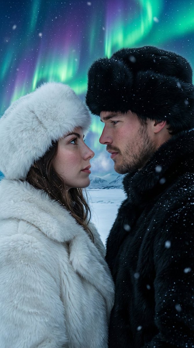 Ultra-photorealistic side-angle (three-quarter profile) couple portrait under vivid Northern Lights in a snowy Arctic night. The uploaded woman and man stand very close, facing each other and looking directly into each other’s eyes with a romantic, calm expression. The woman wears a pure white fur coat with a matching white fur hat; the man wears a deep black, strong, masculine-cut fur coat with a matching black hat. Soft natural snowfall, visible cold breath, realistic Arctic lighting, subtle aurora glow reflecting on their faces. Both faces and identities must remain 100% identical to the uploaded references at all times: same facial structure, proportions, skin texture, eye shape, nose, lips, jawline, and natural expression, with absolutely no beautification, no reshaping, no face swap, no age change, no symmetry correction, and no identity alteration. Natural skin texture, sharp facial focus, shallow depth of field, realistic cinematic look, no distortion, no stylization, pure photorealism.