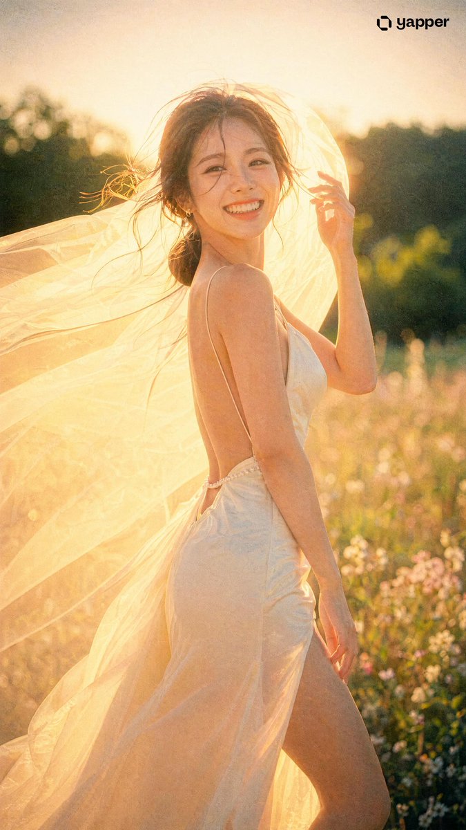 9:16, Japanese-style film photograph, Fujifilm aesthetic, shot on pushed Fuji Pro 400H at ISO 800 prominent visible film grain throughout, warm and intimate. A stunning Korean female idol wearing a sexy modern ivory wedding dress, photographed outdoors in an open wildflower meadow during golden hour, strong backlight from the setting sun behind her. She stands in a confident body-twist pose — upper body facing the camera, weight shifted to her right hip, left knee slightly bent. Her dress is a form-fitting mermaid silhouette with a deep V-neckline revealing her collarbones, ultra-thin spaghetti straps, a dramatic open back exposing her entire back, and a thigh-high slit on the right side revealing her long leg as the skirt fabric parts. The dress is made of ivory silk satin with a sheer tulle overlay that catches the backlight, creating a luminous glow. A delicate pearl waist chain sits at her narrow waist. A single-layer cathedral-length veil of translucent tulle extends behind her head, caught by the wind and billowing upward like a white sail — sunlight streaming through the veil creates a massive, dreamy halo of diffused light around her head and shoulders. She looks directly at the camera with a radiant, genuine Duchenne smile — her eyes crinkle warmly at the corners, teeth showing, eyes bright and happy, as if someone she loves just called her name. Her gaze is warm and inviting with a subtle playful spark. Her left hand is raised, fingers gently touching the floating veil near her face, an effortless gesture that's both elegant and natural. Her right hand rests at her side near the slit of the dress. The backlight is powerful and golden — the low-angle sun at about 10-15 degrees directly behind her creates: 1. A bright golden halo through her veil that wraps around her head and upper body 2. Strong rim light outlining her hair, bare shoulders, and back in warm gold 3. An angelic ring of light in her wind-blown hair 4. Subtle subsurface scattering on her ear edges and fingers 5. The tulle overlay of her dress glowing translucent gold where sunlight passes through 6. Natural warm lens flare with soft golden light streaks entering the frame Her face is lit by soft natural fill light from environmental reflection — cool pink-toned Fujifilm skin that glows with health and warmth, no harsh shadows. Her hair is wind-swept, dark brown strands flying freely, each one outlined in gold by the backlight. Background: completely dissolved into creamy bokeh at f/1.4 — soft washes of golden-green meadow, blurred wildflowers, distant tree silhouettes, and a warm overexposed sky. Everything behind her melts into impressionistic color fields. Fuji Pro 400H pushed to ISO 800 color science — prominent visible film grain (0.4-0.5) coating the entire image, especially noticeable in shadow areas. Cool pink skin tones (Fujifilm signature), greens rendered in fresh teal-cyan, highlights in warm peach-gold (from backlight), shadows leaning violet-blue. Low contrast (0.8), slightly lifted black point for a gentle foggy film feel. The grain adds texture and warmth — it feels like a real photograph you'd find in a Japanese fashion magazine. Strong natural vignette (0.35) drawing the eye toward her luminous face and the halo around her. 35mm lens at f/1.4, shallow depth of field with characteristically rounded Fujinon bokeh, slight warm barrel distortion at edges.A breeze lifts her veil and dress. She is laughing at someone behind the camera. The whole frame radiates joy, warmth, and confident beauty a sundrenched, grainy, imperfectly perfect moment. Masterpiece, best quality, editorial bridal photography, Japanese film aesthetic, Fujifilm pushed grain look, 8K UHD, photorealistic, accurate golden backlight rendering, translucent veil light transmission, individual hair strands in backlight, natural Duchenne smile with eye crinkles, visible film grain throughout.
