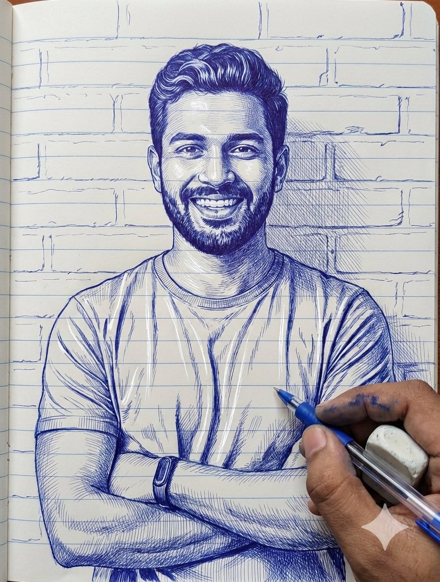 根据上传的图片,创作一张与人物完全相同的照片风格线条画/水墨素描——保留所有面部特征、比例和表情。 使用蓝色和白色墨水色调,以精细的线条细节绘制,背景为笔记本页面风格。 在素描旁显示一只右手,手持钢笔和橡皮擦,仿佛艺术家仍在创作中。