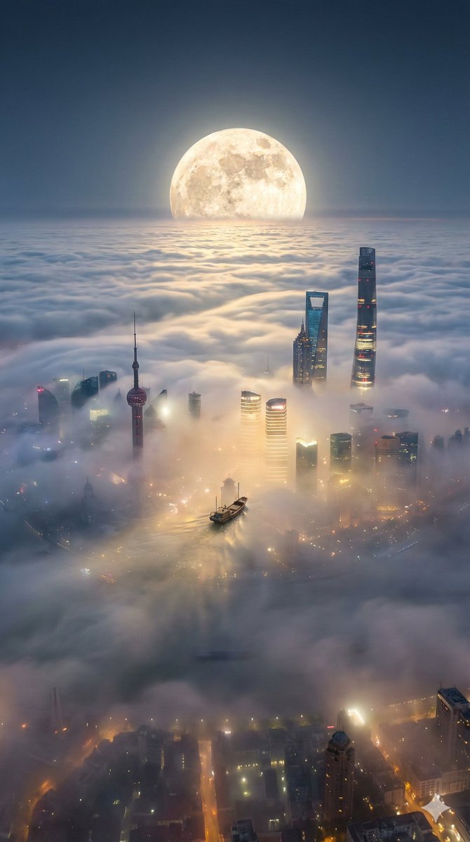 一张**垂直 9:16 纵横比**的照片。令人惊叹的 45 度高角度俯瞰航拍视图。构图以淹没下方城市的浩瀚云海为主。