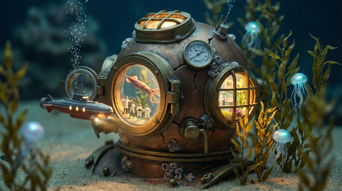一个超精细的微缩 [场景 - 海滩/森林/城市/空间站],构建在一个裂开的 [容器 - 灯泡/雪花球/贝壳/核桃/手表] 内部。微距摄影风格,边缘倾斜移位模糊,温暖的内部灯光溢出,细节极其丰富的微小元素。魔幻现实主义,童话般的奇妙。