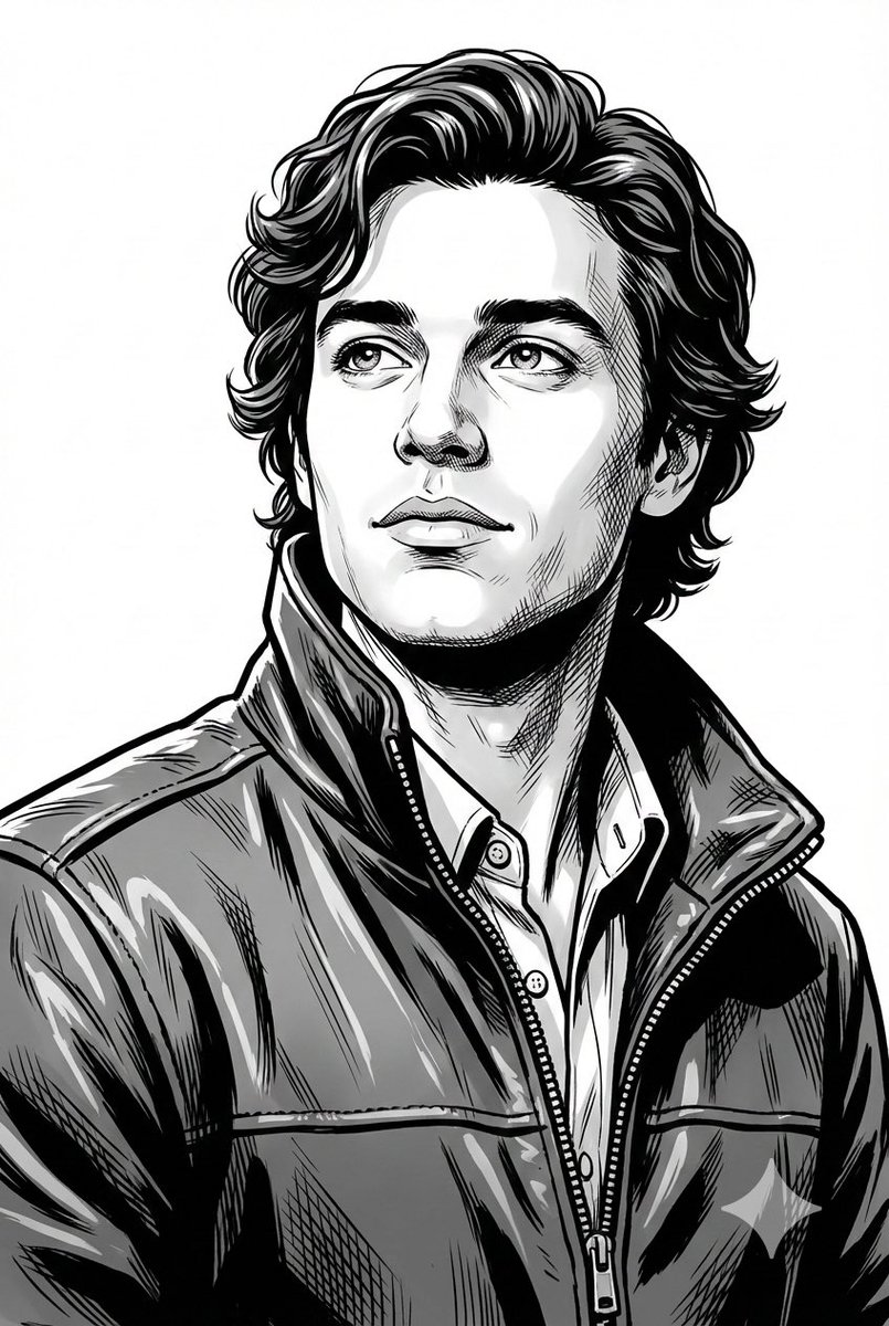 一张肖像尺寸的黑白数码插画,细节丰富,风格为漫画书或矢量艺术,描绘了一个人(uploaded photo),她神情平静。她的眼睛向上并略微看向一侧。她穿着一件正式的翻领衬衫,外面是一件拉链式皮革或飞行员夹克,领子很高,线条干净利落,高对比度阴影和交叉影线勾勒出质感。背景是纯白色,完全聚焦于从胸部以上的人物半身像,角度略微从下方拍摄,以强调她向上凝视的目光。风格让人联想到黑色电影图画小说或现代波普艺术肖像,单色调,从纯黑到纯白渐变。