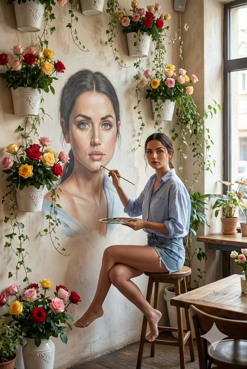 { "type": "image_generation", "style": "ultra-realistic cinematic portrait photography", "resolution": "8K UHD", "aspect_ratio": "2:3 vertical", "face_preservation": { "preserve_identity": true, "preserve_face_shape": true, "preserve_eyes": true, "preserve_nose": true, "preserve_lips": true, "preserve_expression": true, "preserve_skin_texture": true, "preserve_proportions": true, "no_beautification_filter": true, "no_face_modification": true }, "scene": { "location": "cozy artistic café interior", "environment_description": "A warm yet naturally lit café with textured plaster walls, wooden flooring, soft neutral-toned furniture, and an intimate creative atmosphere. The wall has a natural, slightly rough texture with subtle imperfections visible.", "mural_concept": "The woman is painting a large, realistic artistic mural of her own face on the café wall. The mural face must match her real facial features and exact expression perfectly, as if she is painting her own reflection. The mural style is hyper-detailed realism with painterly brush textures visible upon close inspection.", "decor_elements": { "white_decorative_pots": "Elegant matte white ceramic pots arranged near the wall and around the floor area.", "flowers": "Various colors of fresh roses including red, pink, peach, white, and soft yellow.", "plants": "Delicate green vines and climbing plants trailing naturally around the mural edges and along the wall corners.", "ambience": "Artistic, cozy, creative café vibe with subtle decorative charm." } }, "subject": { "position": "Standing slightly angled toward the wall while painting", "action": "Holding a paintbrush mid-stroke while working on the mural", "expression": "Exactly the same as in the uploaded reference image", "pose_details": "Natural relaxed posture, focused and immersed in painting, realistic hand placement holding brush and palette", "clothing": "Casual yet stylish café-artist outfit, soft neutral or earthy tones, natural fabric texture", "hair": "Exactly as in the original image, no changes", "makeup": "Natural and realistic, matching the original photo" }, "lighting": { "type": "soft natural daylight", "direction": "Light entering gently from a nearby window", "temperature": "Neutral daylight (not too warm, not overly golden)", "shadow_style": "Soft diffused shadows with realistic depth", "skin_tone_rendering": "True-to-life color accuracy without oversaturation" }, "camera_settings": { "camera_type": "Full-frame professional DSLR", "lens": "85mm portrait lens", "aperture": "f/2.0", "depth_of_field": "Shallow depth of field with sharp focus on subject and mural face", "focus": "Crisp facial details on both real face and painted mural face", "dynamic_range": "High dynamic range wit{ "type": "image_generation", "style": "超现实电影级肖像摄影", "resolution": "8K UHD", "aspect_ratio": "2:3 竖版", "face_preservation": { "preserve_identity": true, "preserve_face_shape": true, "preserve_eyes": true, "preserve_nose": true, "preserve_lips": true, "preserve_expression": true, "preserve_skin_texture": true, "preserve_proportions": true, "no_beautification_filter": true, "no_face_modification": true }, "scene": { "location": "舒适的艺术咖啡馆内部", "environment_description": "一个温暖而自然采光的咖啡馆,有纹理的石膏墙、木地板、柔和中性色调的家具,以及私密而富有创意的氛围。墙壁具有自然的、略带粗糙的纹理,细微的瑕疵清晰可见。", "mural_concept": "这位女士正在咖啡馆的墙上绘制一幅大型、逼真的自画像壁画。壁画中的脸部必须与她真实的五官和表情完美匹配,仿佛她正在描绘自己的倒影。壁画风格是超细节的写实主义,近距离观察时可见画笔纹理。", "decor_elements": { "white_decorative_pots": "优雅的哑光白色陶瓷花盆,摆放在墙边和地板区域。", "flowers": "各种颜色的新鲜玫瑰,包括红色、粉色、桃色、白色和柔和的黄色。", "plants": "精致的绿色藤蔓和攀缘植物,自然地缠绕在壁画边缘和墙角。", "ambience": "艺术、舒适、富有创意的咖啡馆氛围,带有微妙的装饰魅力。" } }, "subject": { "position": "身体略微倾斜向墙壁,正在绘画", "action": "手持画笔,正在壁画上进行中途描绘", "expression": "与上传的参考图片中完全一致", "pose_details": "自然放松的姿势,专注并沉浸在绘画中,手部姿势真实地握着画笔和调色板", "clothing": "休闲而时尚的咖啡馆艺术家服装,柔和的中性色或大地色调,天然面料质感", "hair": "与原始图片中完全一致,无任何改变", "makeup": "自然逼真,与原始照片相符" }, "lighting": { "type": "柔和的自然日光", "direction": "光线从附近的窗户柔和地射入", "temperature": "中性日光(不过暖,不过于金黄)", "shadow_style": "柔和漫射的阴影,具有真实的深度", "skin_tone_rendering": "真实准确的肤色还原,无过度饱和" }, "camera_settings": { "camera_type": "全画幅专业单反相机", "lens": "85mm 肖像镜头", "aperture": "f/2.0", "depth_of_field": "浅景深,主体和壁画脸部清晰对焦", "focus": "真实脸部和壁画脸部都具有清晰的面部细节", "dynamic_range": "高动态范围" } }