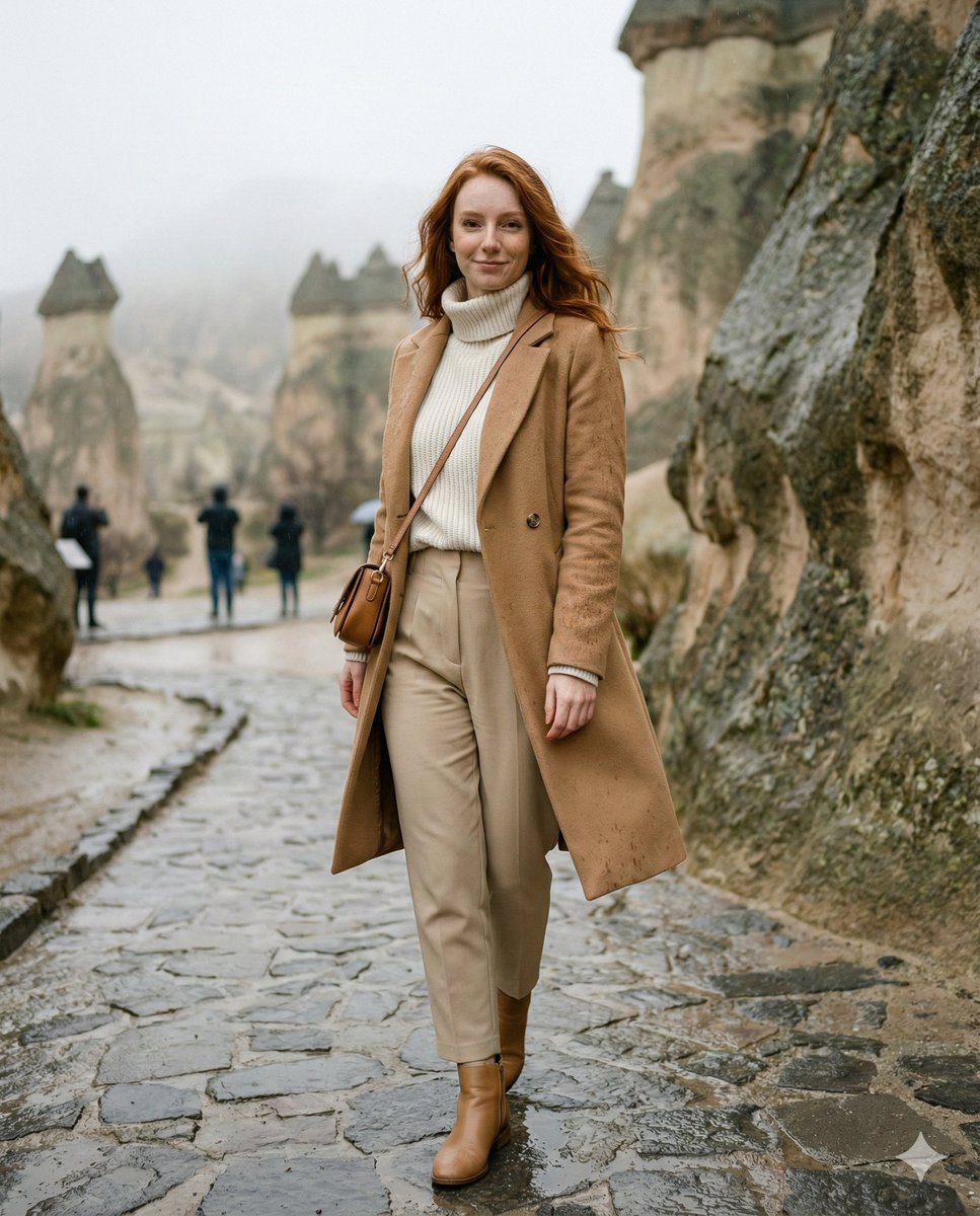 { "aspect_ratio": "4:5", "prompt_addon": "Cappadocia, Paşabağ (Monks Valley) fairy chimneys on January 30. Cloudy winter afternoon with intermittent light showers; cool air, lightly wet stone path, subtle puddle reflections on tuff rock textures. Tusina walking on the path between tall fairy chimneys, turning her head back toward the camera with a softly flirty, playful smile and quiet confidence—premium travel influencer energy, approachable and warm. Outfit: winter travel-chic—camel wool coat (or waterproof trench), off-white thick knit turtleneck, high-waist beige trousers, light brown leather ankle boots with good grip, minimal gold jewelry, small leather crossbody bag. Optional prop: folded compact umbrella or a small takeaway hot drink cup; a few tiny raindrops visible on coat fabric (realistic, not dramatic). Hair: natural ginger/copper, slightly wind-touched with a clean natural look (not soaked). Background: fairy chimneys and cave openings with soft mist/haze, wet rocks slightly darker and richer; no crowds, just one or two distant silhouettes heavily blurred. Mood: cozy winter wanderlust, editorial realism, natural skin with freckles, authentic textures, no overprocessing.", "camera": { "shot_type": "full body / 3-4 portrait (head to shoes), walking candid", "lens_mm": 35, "aperture": "f/2.0", "focus": "tack sharp on eyes/face; background softly separated", "composition": "leading lines from wet path toward fairy chimneys; Tusina slightly off-center; strong subject separation", "camera_position": "slightly low angle, close-mid distance for influencer hero shot" }, "lighting": { "time": "late afternoon (winter)", "key_light": "soft diffused overcast light (cloudy), gentle highlights on face", "fill": "natural bounce from wet rock surfaces", "atmosphere": "subtle mist + light drizzle remnants, realistic micro-contrast" }, "style": { "render": "editorial realism, high-detail textures, natural skin", "film": "Kodak Portra 800 vibe, subtle film grain", "color": "warm neutrals + muted winter earth tones, realistic saturation", "post": "clean premium grade, no beauty-filter look, no HDR" }, "identity_lock_notes": [ "Use the reference photo as the primary identity anchor", "Preserve facial features exactly; avoid face drift", "Keep natural freckles visible; keep ginger/copper hair true", "Keep physique slim-fit (pilates/walking-built), natural proportions" ], "negative_prompt": [ "anime, illustration, cartoon, 3d, cgi, doll-like", "over-smoothed skin, plastic skin, heavy beauty filter, waxy face", "face drift, different person, altered facial structure, exaggerated lips", "bad anatomy, deformed hands, extra fingers, awkward pose", "low-res, blurry, noise blobs, jpeg artifacts, watermark, text, logo", "overexposed highlights, harsh flash, unreal HDR, neon colors", "crowds, busy tourists, cluttered backgr"{ "aspect_ratio": "4:5", "prompt_addon": "1 月 30 日,卡帕多奇亚,帕夏贝(僧侣谷)的仙人烟囱。多云的冬日午后,间歇性小雨;空气凉爽,石板路微湿,凝灰岩纹理上倒映着细微的水洼。图西娜走在高耸的仙人烟囱之间的小路上,她回过头看向镜头,带着一丝俏皮、玩味的微笑和沉静的自信——散发着高端旅行博主的魅力,亲切而温暖。服装:冬季旅行时尚风——{argument name=\"coat type\" default=\"驼色羊毛大衣\"}(或防水风衣),米白色厚针织高领毛衣,高腰米色长裤,抓地力好的浅棕色皮质踝靴,极简金色首饰,小巧的皮质斜挎包。可选道具:一把折叠式迷你雨伞或一杯外带热饮;大衣面料上可见几滴细小的雨珠(真实感,不夸张)。发型:自然姜色/铜色,略带风吹痕迹,干净自然(未湿透)。背景:仙人烟囱和洞穴开口处弥漫着柔和的薄雾/霾,湿润的岩石颜色略深、更饱满;没有人群,只有一两个模糊的远景人影。氛围:舒适的冬日漫游情怀,纪实美学,自然肌肤带雀斑,真实纹理,无过度后期。", "camera": { "shot_type": "全身/四分之三肖像(从头到脚),抓拍行走中", "lens_mm": 35, "aperture": "f/2.0", "focus": "眼睛/面部锐利对焦;背景柔和分离", "composition": "湿润的小路形成引导线通向仙人烟囱;图西娜略微偏离中心;主体分离感强", "camera_position": "略低角度,中近距离,用于网红式特写" }, "lighting": { "time": "下午晚些时候(冬季)", "key_light": "柔和漫射的阴天光线(多云),面部有柔和高光", "fill": "湿润岩石表面的自然反弹光", "atmosphere": "细微的薄雾 + 小雨残留,真实的微对比度" }, "style": { "render": "纪实美学,高细节纹理,自然肌肤", "film": "柯达 Portra 800 胶片感,细微胶片颗粒", "color": "暖中性色 + 柔和的冬季大地色调,真实饱和度", "post": "干净的高级质感,无美颜滤镜效果,无 HDR" }, "identity_lock_notes": [ "以参考照片作为主要身份锚点", "精确保留面部特征;避免面部漂移", "保留可见的自然雀斑;保持姜色/铜色头发的真实性", "保持纤细身材(普拉提/步行锻炼型),自然比例" ], "negative_prompt": [ "动漫,插画,卡通,3D,CGI,玩偶般", "过度平滑的皮肤,塑料感皮肤,厚重美颜滤镜,蜡质脸", "面部漂移,不同的人,改变的面部结构,夸张的嘴唇", "糟糕的解剖结构,畸形的手,多余的手指,笨拙的姿势", "低分辨率,模糊,噪点块,JPEG 伪影,水印,文字,标志", "过度曝光的高光,刺眼闪光,不真实的 HDR,霓虹色", "人群,忙碌的游客,杂乱的背景" ] }