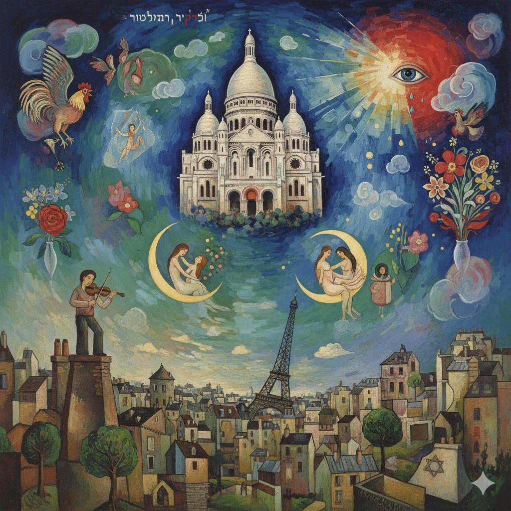 英文提示词中文提示词复制Generate an image of the Sacré-Cœur Basilica as a painting in the style of Chagall!生成一张圣心大教堂的画作,风格为 Chagall!