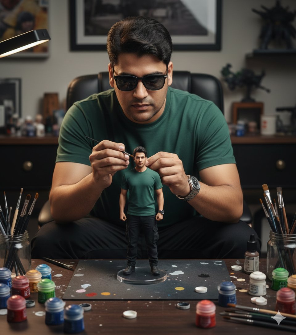 'prompt': 'A hyper-realistic, cinematic scene of the man from the uploaded image sitting at a creative workshop desk, making direct eye contact with the camera. He is carefully painting a large miniature figurine of himself using a fine brush. The figurine is about half his height, standing on a clear acrylic base, and is an exact replica of him, wearing the same green t-shirt, black cargo pants, sunglasses, and silver watch. The figurine has lifelike human skin tones and a premium texture. The desk is cluttered with realistic miniature-painting tools, paint pots, and brushes. Cinematic studio lighting, sharp focus, high-quality detail, realistic indoor hobby room background.'