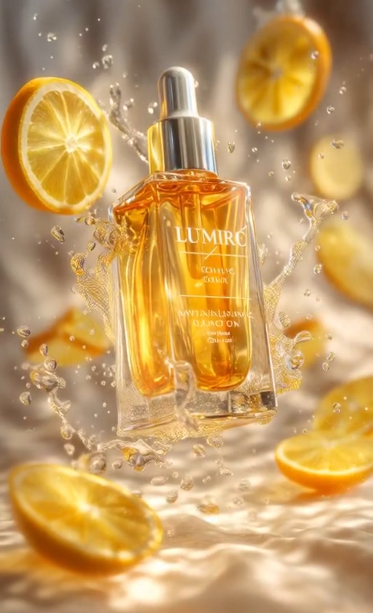 超逼真的奢华护肤品摄影,一款优质金色维生素 C 面部精华油,盛装在优雅的多面玻璃滴管瓶中,瓶身标有“LUMIRÓ ÉLIXIR VITAMIN C”,配有光滑的金属银色瓶盖和滴管,瓶内液体呈温暖的琥珀橙色,居中突出。一位美丽的西方女性,肌肤容光焕发,长发飘逸,身穿柔软的白色丝绸长袍,优雅地与产品互动(手持滴管或欣赏精华液),自然地置于瓶身旁边。周围是新鲜多汁的柠檬片,以动态姿态爆裂,充满活力的黄色柑橘汁液飞溅,水花四溅,涟漪荡漾,呈现高速定格效果。明亮璀璨的金色光线,电影般的体积光束,闪烁的亮点和散景,超详细的玻璃反光,清新奢华的美容广告美学,专业影棚拍摄,微距镜头细节,8k 分辨率,照片级真实感,鲜艳的柑橘色调,高对比度,戏剧性的液体动态效果 --ar 3:4 --stylize 250 --v 6 --q 2