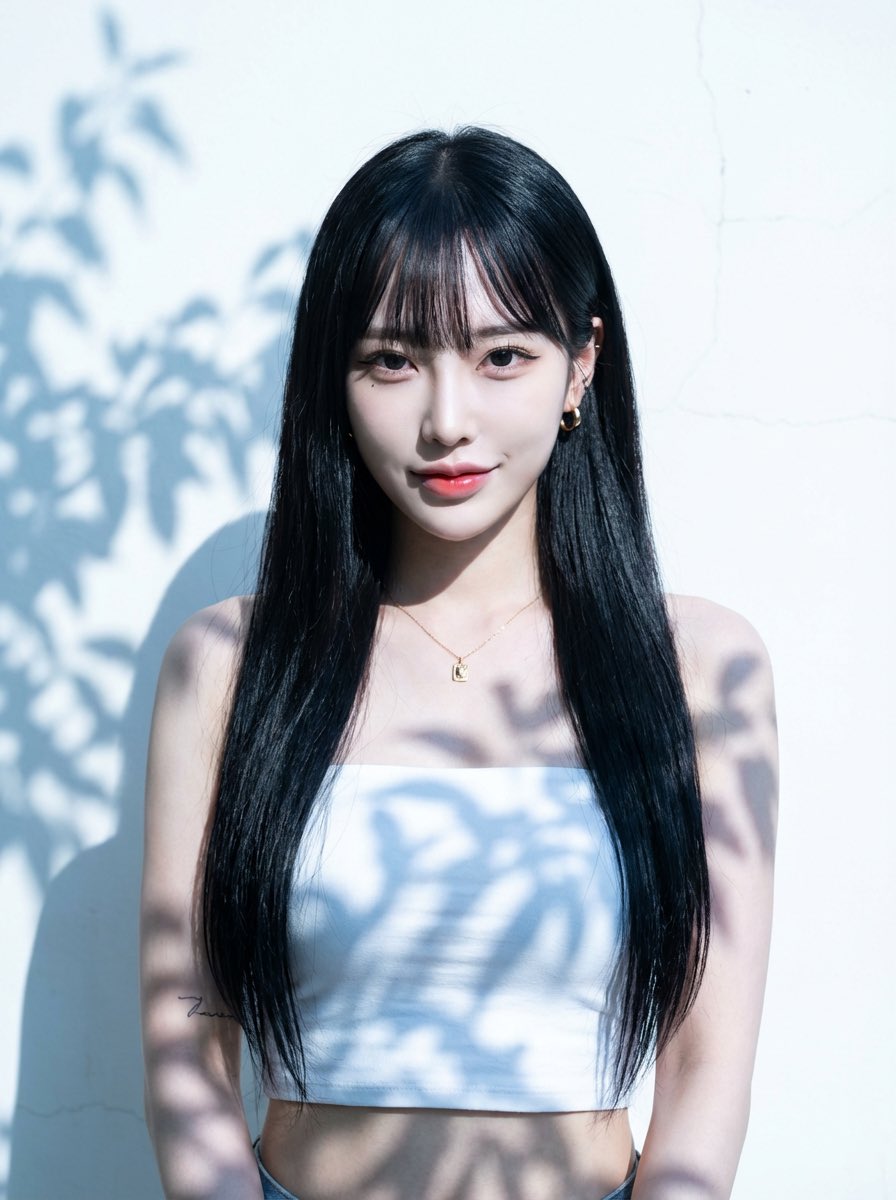 I. Composition & Spatial Layout 1.Framing & Scale: The subject occupies approximately 60–70% of the frame height. Leave at least 30% of the frame height as empty space above the head. Both left and right sides retain clearly visible empty wall space. 2.Visual Focus: A minimal, uncluttered background designed to strongly emphasize facial structure, eye expression, and skin quality. II. Lighting & Shadow Style 1.Key Light: Intense natural daylight, side-backlit with a slight reverse angle, cool-toned, producing extreme high-contrast separation between highlights and shadows. 2.Light Characteristics: Dense, hard-edged leaf-shadow patterns projected across the wall and the subject’s body and face. Shadow edges are razor-sharp with extremely narrow penumbra. 3.Highlight Control: Large areas of the background are deliberately overexposed while retaining faint surface texture, creating a glowing, almost blinding spatial atmosphere. III. Subject Appearance (Face & Hair — Reference Applied) 1.Facial Structure: A young Japanese woman in her 20s with a refined V-shaped face, sharp jawline, and high-definition facial contours. Overall facial balance is elegant yet striking, with high visual impact. 2.Skin Quality: Porcelain-toned Japanese skin with a cool undertone. Ultra-smooth, luminous texture enhanced by strong contrast lighting while retaining realistic skin detail. 3.Eyes & Expression: ・Large, sharp fox-shaped eyes ・Confident gaze directed straight into the camera ・Expression carries a cool, playful, slightly teasing energy ・K-pop idol–inspired eyeliner with clearly emphasized aegyosal ・Overall expression is controlled, calm, and subtly provocative rather than smiling 4.Mouth: Relaxed lips with a subtle, effortless smirk. Glossy gradient lips with a refined sheen, never exaggerated. 5.Hair Style: Long, sleek, straight black hair reaching the waist, with perfectly straight, neatly trimmed Japanese bangs. Hair finish is glossy, clean, and fashion-forward, moving minimally in the light. 6.Makeup Style: High-contrast K-pop idol–inspired makeup. Clean base, sculpted facial structure, cool-toned color balance, no warm or heavy blush. 7.Accessories (Minimal): ・Small gold pendant necklace ・Small gold hoop earrings ・Minimalist tattoo on the left inner forearm IV. Clothing ・Cropped pure-white bandeau-style tube top ・Body-hugging but not tight, exposing the waist ・Fabric remains clean and structured, no wrinkles distracting from silhouette