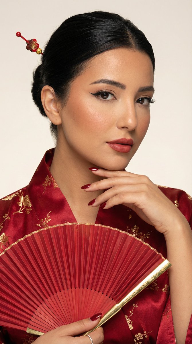 { "generation_request": { "meta_data": { "tool": "NanoBanana Pro", "task_type": "ultra_photoreal_editorial_beauty_transformation", "version": "v1.0_RED_KIMONO_FAN_HAIRPIN_BEAUTY_EN", "priority": "highest", "language": "en" }, "input": { "mode": "image_to_image", "reference_image_usage": "very_high", "preserve_pose": true, "preserve_hand_structure": true, "notes": "Use the uploaded reference image as the composition anchor. Keep the same close-up beauty framing and the hand near the face. Transform wardrobe and styling to a red kimono theme with a matching fan and hair accessory. No text." }, "output_settings": { "aspect_ratio": "4:5", "orientation": "portrait", "resolution_target": "ultra_high_res", "render_style": "luxury_editorial_beauty", "sharpness": "editorial_crisp_with_real_skin", "film_grain": "subtle_or_none", "color_grade": "warm_red_lacquer_tones", "dynamic_range": "natural_not_hdr", "skin_rendering": "real_pores_soft_glow_no_plastic" }, "global_rules": { "camera_language": "85mm beauty lens equivalent, tight close-up framing, shallow depth of field, editorial precision", "lighting_language": "soft diffused beauty key light + gentle specular highlights on skin + controlled shadow shaping", "authenticity_markers": "natural skin texture, visible pores, no AI glow, no HDR, no over-smoothing" }, "creative_prompt": { "scene_summary": "High-end editorial beauty portrait with a Japanese-inspired red kimono styling. A matching folding fan and elegant hairpin accessory. Harmonized makeup and nails.", "environment": { "background": "minimal studio backdrop in warm off-white or very light beige, with a subtle red lacquer ambience clean", "lighting": "soft beauty lighting with a slight warm rim light; balanced highlights, no harsh shine" }, "subject": { "person": "adult woman", "expression": "calm confident editorial gaze", "hair": "sleek dark hair styled neatly with a red-and-gold hairpin (kanzashi-inspired), a few soft face-framing strands", "makeup": { "eyes": "clean winged eyeliner, soft neutral-brown shadow, subtle shimmer on inner corners", "brows": "natural defined brows", "cheeks": "soft warm blush, slightly rosy but refined", "lips": "muted red/rose lacquer lip not overly glossy, lips closed" }, "nails": "short elegant manicure in deep red (wine red) to match the kimono and fan" }, "wardrobe": { "kimono": "red silk kimono with subtle tone-on-tone pattern (floral or geometric), premium fabric folds, elegant collar line, no logos", "details": "optional thin gold accent trim, tasteful and minimal" }, "props": { "fan": "folding hand fan in matching red with gold accents, held near the face/hand area, elegant and harmonious" }, "composition": "tight beauty close-up similar to reference, hand near face visible, jewelry minimal (one statement ring allowed), shallow depth of field, ultra detailed skin and makeup texture" }, "negative_"{ "generation_request": { "meta_data": { "tool": "NanoBanana Pro", "task_type": "ultra_photoreal_editorial_beauty_transformation", "version": "v1.0_RED_KIMONO_FAN_HAIRPIN_BEAUTY_EN", "priority": "highest", "language": "en" }, "input": { "mode": "image_to_image", "reference_image_usage": "very_high", "preserve_pose": true, "preserve_hand_structure": true, "notes": "使用上传的参考图像作为构图锚点。保持相同的特写美妆构图和手部靠近脸部。将服装和造型转换为红色和服主题,搭配配套的扇子和发饰。无文字。" }, "output_settings": { "aspect_ratio": "4:5", "orientation": "portrait", "resolution_target": "ultra_high_res", "render_style": "luxury_editorial_beauty", "sharpness": "editorial_crisp_with_real_skin", "film_grain": "subtle_or_none", "color_grade": "warm_red_lacquer_tones", "dynamic_range": "natural_not_hdr", "skin_rendering": "real_pores_soft_glow_no_plastic" }, "global_rules": { "camera_language": "85mm 美妆镜头等效,紧凑特写构图,浅景深,杂志级精准度", "lighting_language": "柔和漫射美妆主光 + 皮肤上柔和的镜面高光 + 受控的阴影塑形", "authenticity_markers": "自然皮肤纹理,可见毛孔,无 AI 光泽,无 HDR,无过度平滑" }, "creative_prompt": { "scene_summary": "高端杂志美妆肖像,采用日式红色和服造型。搭配配套的折扇和优雅发簪。和谐的妆容和美甲。", "environment": { "background": "极简影棚背景,暖米白或极浅米色,带有微妙的红色漆器氛围,干净整洁", "lighting": "柔和美妆光线,带有一丝暖色轮廓光;平衡的高光,无刺眼反光" }, "subject": { "person": "成年女性", "expression": "沉着自信的杂志凝视", "hair": "光滑的深色头发,整齐地盘起,配有红金发簪(簪子风格),几缕柔和的碎发修饰脸型", "makeup": { "eyes": "干净的眼线,柔和的中性棕色眼影,内眼角有微妙的微光", "brows": "自然清晰的眉毛", "cheeks": "柔和的暖色腮红,略带红润但精致", "lips": "柔和的红/玫瑰漆光唇,不过分油亮,双唇紧闭" }, "nails": "短款优雅美甲,深红色(酒红色),与和服和扇子相配" }, "wardrobe": { "kimono": "红色丝绸和服,带有微妙的同色系图案(花卉或几何),优质面料褶皱,优雅领口线条,无标志", "details": "可选的细金边点缀,雅致且极简" }, "props": { "fan": "折叠手扇,配套的红色,带有金色点缀,靠近脸部/手部区域,优雅和谐" }, "composition": "紧凑的美妆特写,类似于参考图,手部靠近脸部可见,首饰极简(允许一枚个性戒指),浅景深,超详细的皮肤和妆容纹理" }, "negative_" }