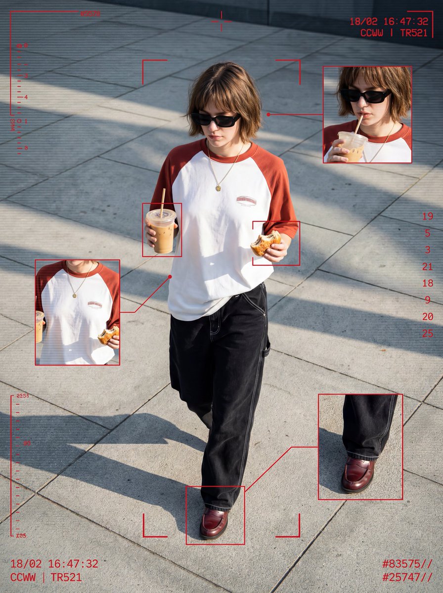 赛博朋克垃圾摇滚风格的监控时尚大片,8K 超高清 4:5 (1440×1920)。从高角度闭路电视视角拍摄全身照,35 毫米镜头,深景深。一名冷酷疏离的女子(20 岁出头)正迈步走过阳光漂白的灰色广场瓷砖,午后黄金时段的光线在她左侧投下锐利的斜影。齐下巴的纹理波波头,随意刘海,戴着厚厚的黑色太阳镜,头微微低下。她穿着一件超大号白色 T 恤,配有锈红色插肩袖和小胸部标志,松散地塞进宽松的黑色工装牛仔裤(白色缝线),勃艮第色乐福鞋,戴着一条精致的金色吊坠。左手拿着一杯带吸管的冰咖啡/巧克力塑料杯,右手拿着一块吃了一半的糕点。皮肤毛孔、织物纹理、路面沙砾都超写实。冷酷的都市色调:中性灰色、白色、锈红色、牛仔黑,点缀着鲜艳的深红色战术 HUD 叠加层:红色边框、十字准线、遥测字形、扫描线、时间码“18/02”、ID 字符串“CCWW | TR521”、数字流“19 5 3 21 18 9 20 25”、话题标签“#83575// #25747//”。碎片化布局:主全身画面加上三个嵌入式裁剪(脸部/饮料、躯干、裤脚),由细红色矢量线连接。颗粒感、微妙的色差、高锐度、原始照片般逼真度。情绪:Y2K 街头服饰、反乌托邦时尚、偷拍的隐私侵犯瞬间、无处不在的凝视下的都市冷漠。