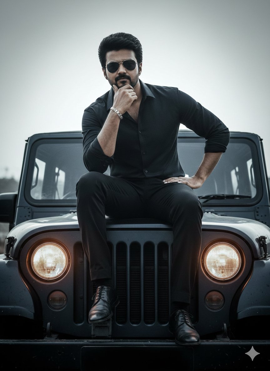 { "prompt": "Hyper-realistic 8K cinematic portrait, slightly low-angle perspective, powerful and intense atmosphere. Subject uses uploaded face as exact reference (no facial alteration, perfect likeness). Subject seated confidently on the front hood of a dark rugged jeep-style vehicle, legs crossed at the ankles. One hand resting casually on chin, other hand on hip. Wearing collared long-sleeve shirt with sleeves rolled up to forearms, dark tailored trousers, dark dress shoes, aviator sunglasses, metallic bracelet on left wrist. Jeep front grille with vertical slats and two glowing circular headlights dominating lower frame, headlights casting warm localized light. Windshield reflecting blurry desaturated background with vague distant figures or structures. Dramatic high-contrast lighting with strong backlight creating rim light around hair and silhouette, soft frontal key light illuminating subject. Desaturated cinematic color palette, cool monochatic greys with subtle dark blue tones in vehicle and warm amber highlights from headlights. Ultra-detailed skin, fabric, and vehicle textures. Gritty yet polished aesthetic. Shallow depth of field. Shot on 85mm lens, f/1.8, ultra sharp focus, professional studio quality.", "negative_prompt": "blurry, low resolution, cartoon, anime, illustration, painting, oversharpen, plastic skin, distorted face, wrong anatomy, extra fingers, extra limbs, watermark, logo, text, grainy, overexposed, underexposed" }{ "prompt": "超写实 8K 电影级肖像,略微低角度透视,营造出强大而紧张的氛围。主体使用上传的面部作为精确参考(面部无改动,完美相似)。主体自信地坐在深色坚固吉普车式车辆的前引擎盖上,双腿在脚踝处交叉。一只手随意地托着下巴,另一只手放在臀部。穿着领口长袖衬衫,袖子卷到前臂,深色定制长裤,深色正装鞋,飞行员墨镜,左手腕戴着金属手链。吉普车前格栅带有垂直板条和两个发光的圆形大灯,占据画面下部,大灯投射出温暖的局部光线。挡风玻璃反射出模糊的、去饱和的背景,带有模糊的远方人物或建筑。戏剧性的高对比度照明,强烈的背光在头发周围和轮廓上形成轮廓光,柔和的前方主光照亮主体。去饱和的电影级调色板,冷色调的单色灰色,车辆中带有微妙的深蓝色调,大灯发出温暖的琥珀色高光。明亮、过曝的渐变灰色背景暗示着阴天或强烈的后方光源。超详细的皮肤、织物和车辆纹理。粗犷而精致的美学。浅景深。使用 85mm 镜头拍摄,f/1.8,超清晰对焦,专业工作室品质。", "negative_prompt": "模糊,低分辨率,卡通,动漫,插画,绘画,过度锐化,塑料皮肤,扭曲的面部,错误的解剖结构,多余的手指,多余的肢体,水印,标志,文字,颗粒感,过曝,欠曝" }