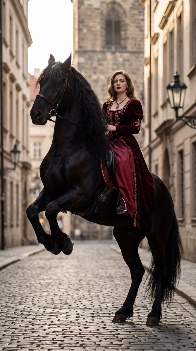 { A high-fashion European female model seated elegantly on a deep black European horse in a powerful rearing pose with the front two legs lifted upward, captured in a dramatic low-angle cinematic hero shot, wearing a luxurious high-European traditional outfit in dark red tones with rich embroidery and velvet-silk texture, adorned with antique European jewellery including a royal necklace, ornate earrings, and elegant hand accessories, her expression calm, confident, and regal with soft wavy hair and premium fashion makeup featuring bold eyes and deep red lips, set on a European vintage street with cobblestone roads, classic stone buildings, antique balconies, and old street lamps creating a timeless royal atmosphere, illuminated by natural cinematic side lighting with soft golden highlights, subtle ambient fill, and gentle rim light defining the silhouette of the model and horse, photographed using a 50mm cinematic prime lens in vertical 3:4 aspect ratio with shallow depth of field, sharp focus on subject, softly blurred background, slight motion in the horse’s mane, ultra-high-resolution studio quality, luxury editorial color grading with rich reds, deep blacks, warm highlights, clean premium finish, no text, no logos, no watermark, no distortion. }{ 一位时尚的欧洲女模特,优雅地坐在一匹强壮的欧洲马上,马匹呈腾跃姿势,前腿高高抬起。画面以戏剧性的低角度电影英雄式镜头捕捉,模特身着华丽的欧洲传统服饰,色调为 dark red,带有丰富的刺绣和天鹅绒丝绸质感,佩戴着古董欧洲珠宝,包括一条皇家项链、华丽的耳环和优雅的手部配饰。她表情平静、自信、高贵,留着柔和的波浪发型,化着精致的时尚妆容,突出大胆的眼妆和深红色嘴唇。场景设置在一条欧洲复古街道上,有鹅卵石路面、经典的石头建筑、古老的阳台和旧路灯,营造出永恒的皇家氛围。画面由自然的电影侧光照明,带有柔和的金色高光、微妙的环境补光和柔和的轮廓光,勾勒出模特和马匹的轮廓。使用 50mm 电影定焦镜头拍摄,纵向 3:4 宽高比,景深较浅,主体对焦锐利,背景柔和模糊,马鬃有轻微动感,超高分辨率工作室品质,奢华编辑级调色,包括丰富的红色、深邃的黑色、温暖的高光,呈现干净的高级质感,无文字,无标志,无水印,无失真。 }