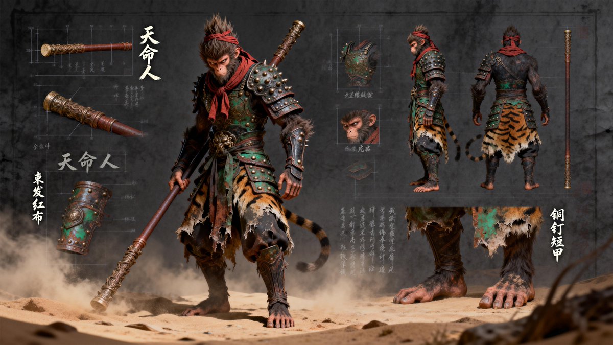 角色设计稿,深灰做旧纸纹背景,技术蓝图风格,毛笔手写中文标注,多角度散点缩略图(正面/背面/侧面/武器特写),暗黑东方神魔角色设计全流程展示。 【角色档案】 天命人(大圣残躯转世) · 花果山旧部 · 踏上寻根之路的无名猿猴 性情:沉默寡言,意志如铁,杀伐果断 宿命:背负大圣遗志,踏遍六根,寻回真身 【形貌特征】 身形精悍,猿猴体态,四尺余高,肌肉虬结却不臃肿,爆发力藏于精瘦躯干。雷公嘴紧抿,铜铃圆目冷光内敛,眉弓高耸,面部毛发稀疏处可见皮肤粗糙纹理,神情冷峻如铁。头顶无金箍,唯有一道深陷勒痕伤疤环绕,是旧日束缚的印记。通体棕褐毛发,杂有灰白,根根分明,沾染尘土与干涸血污。 【装备系统】 - 头部:散乱棕毛束成短髻,一条褪色红布条缠绕扎紧,布条边缘残破抽丝,颜色从暗红渐变至灰白 - 躯干:铜钉短甲覆盖胸背,甲片青铜锈蚀呈斑驳绿色,铜钉氧化发黑,内衬土黄粗麻布衫,衣襟染有喷溅状血渍与泥点 - 下身:虎皮战裙,虎纹斑驳磨损,皮革边缘毛糙开裂起皮,以铜扣兽皮带系于腰间 - 腿足:小腿紧缠麻布绑腿,布条泛黄汗渍浸透,赤足裸露,脚掌厚茧层叠,趾甲灰黑如铁 - 披挂:背后斜挂一片褪色暗红披风残布,边缘烧焦撕裂,随风轻扬 【兵器法宝】 - 主武器:如意金箍棒(默认形态:碗口粗铁棍),长1800mm,直径85mm。通体玄铁乌黑深沉,两端鎏金大半剥落露出铁胎,棒身刻有「如意金箍棒 重一万三千五百斤」铭文,字迹锈蚀模糊 - 随身物:腰间系三根救命毫毛,金色细丝束成小缕;土地庙香灰葫芦一枚 【视觉风格】 虚幻5引擎电影级CG写实渲染,低饱和暗黑色调 主色:赭石棕 + 铜锈绿 + 玄铁黑 | 点缀:暗血红、鎏金残迹 材质:毛发根根分明沾染灰尘、青铜氧化斑驳、虎皮粗粝磨损、麻布泛黄陈旧 光影:侧逆光丁达尔光束穿透飞扬烟尘,昏黄暮色笼罩,飞灰落叶粒子漂浮 【装备拆解图】 - 如意金箍棒:棒身锈蚀纹理与鎏金剥落细节(长1800mm,端箍直径120mm) - 铜钉短甲:甲片排列与铜钉氧化分布(胸甲宽380mm,甲片32片) - 虎皮战裙:皮革裁剪与铜扣腰带(腰围680mm,裙长450mm) - 猿足特写:脚掌茧层、趾甲厚度、毛发过渡(足长280mm) 【画面构成】 主角色呈「单手拄棒立于身侧,身躯微微前倾,冷眼直视前方,如猛兽蓄势待发」之姿 氛围背景:身后隐约残破巨佛石像轮廓,黄沙飞扬,枯枝散落地面 周围标注:(束发红布、铜钉短甲、虎皮战裙、麻布绑腿、如意金箍棒) 尺寸标记:1800mm、380mm、450mm、280mm 【视觉气质】 孤胆战神踏上天命之路,苍凉悲壮,电影级暗黑东方神魔美学,敦煌造像与山西古建气韵,超高清毛发材质写实标注,虚幻引擎次世代品质,天命难违的沉重宿命感