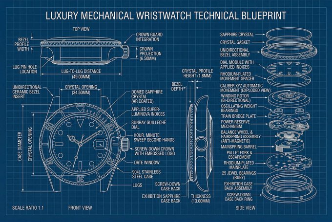 [ product name ], technical blueprint drawing, orthographic view, front view + side view + top view, white vector line art, thin construction lines, precise measurements, annotation labels, dimension arrows, grid background, deep blue background, minimal design, engineering schematic style, high detail