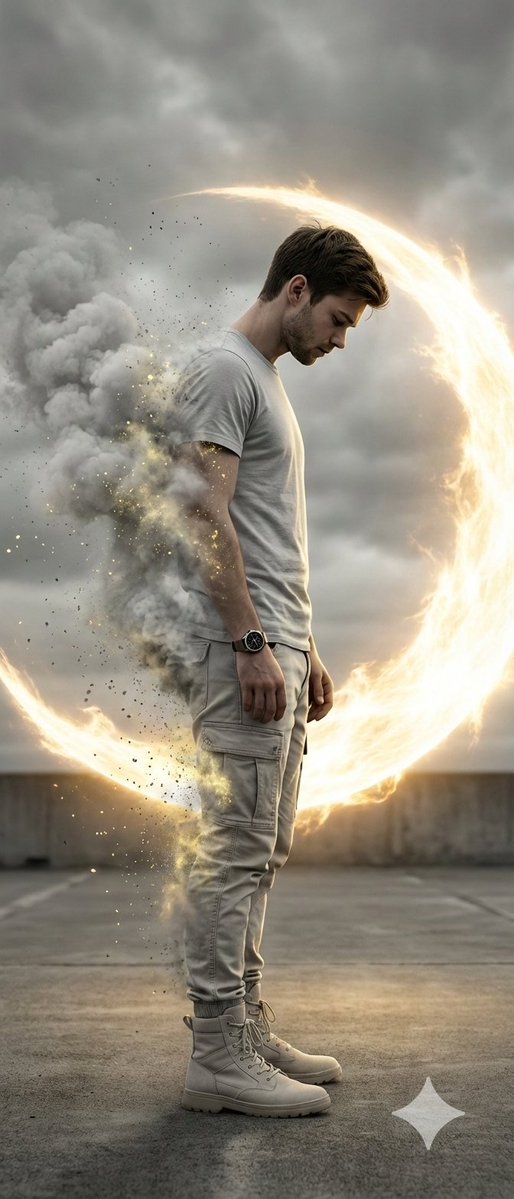 将此图像 [上传您的图像] 转换为 64K 单反相机拍摄分辨率的超写实电影级 64K 肖像,具有超高对比度的戏剧性照明和照片般真实的数字绘画美学——精确使用面部参考。该男子(与上传图像中的面部相同)以全身侧面轮廓示人,面向右侧,他的脸、短而黑的头发和修剪整齐的胡须完美复制,没有任何改动。他穿着现代休闲街头服饰:浅灰色圆领 T 恤、浅中性战术工装牛仔裤、浅色高帮靴子,左手腕戴着手表。他的姿势略显颓废,头低着,眼睛向下看,双手自然垂在身体两侧,传达出深刻的内省和悲伤。他近一半的身体正在消散成极其浓密的云状灰色烟雾,烟雾中充满了发光的黄色尘埃颗粒。他的左臂、肩膀、躯干、腿部和部分头发变得透明,分解成发光的颗粒,暗示着正在进行的瓦解。在他身后并部分环绕着他的是一个巨大的发光新月形(C 形)能量光环,散发着炽热的金白色等离子光。这个光环充当强大的轮廓光和背光,突出烟雾、尘埃和剪影。场景极简而荒凉:混凝土或荒芜的铺面与阴云密布的天空相接。调色板几乎是单色的灰色和白色,与强烈的琥珀金色光芒形成对比。浅景深、辉光/泛光照明、粒子散射、电影构图、情感和戏剧性氛围。Octane 渲染和虚幻引擎。