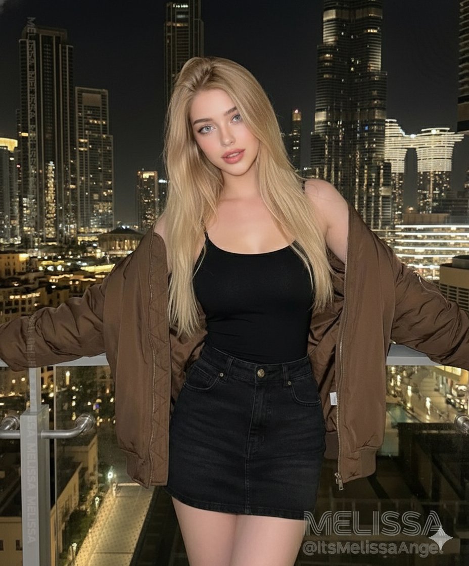 Photorealistic cinematic fashion portrait of a beautiful young blonde model with piercing blue eyes and long, silky blonde hair, wearing a black sheer polka-dot spaghetti-strap top layered over a sleek black body-hugging bodysuit, dark denim mini skirt, and a brown oversized bomber jacket draped open. She is standing on a high-rise balcony with arms wide open, overlooking an epic Dubai nighttime cityscape with towering illuminated skyscrapers and the Burj Khalifa dominating the skyline. Vibrant city lights, dark night sky. Dramatic cinematic lighting with strong rim light highlighting her hair and silhouette, soft key light on the face, subtle fill, high contrast. Ultra-realistic, intricate details, natural skin texture, fashion editorial style, cinematic color grading, shallow depth of field, sharp focus. Shot on Canon EOS R5, 8K realism, portrait orientation, aspect ratio 3:4, stylize 300, quality 2.