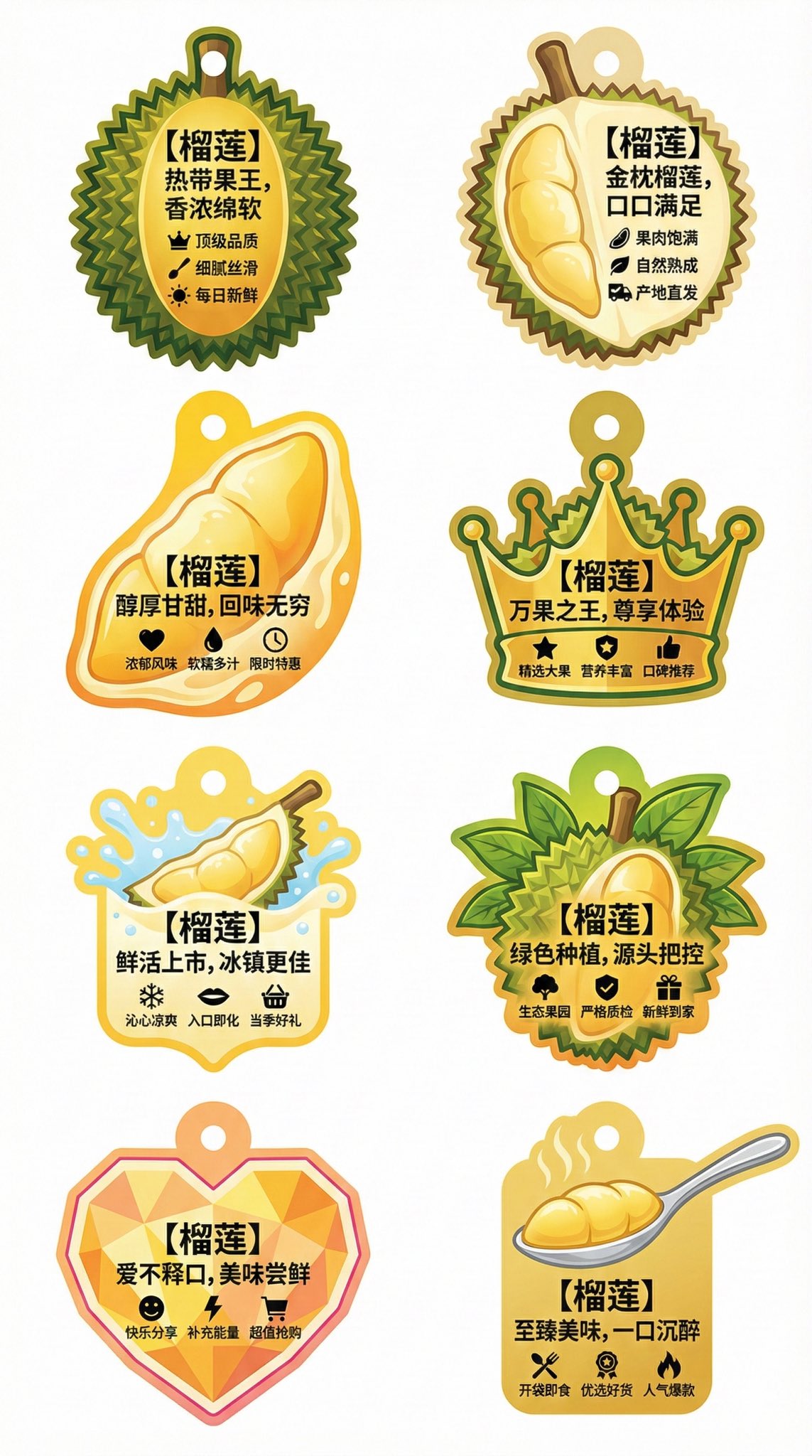 Please generate a creative irregular-shaped advertising tag flat design collection for 【Durian】, displaying 8 different design proposals in one image, arranged in 2 vertical columns, 9:16. Specific requirements are as follows: