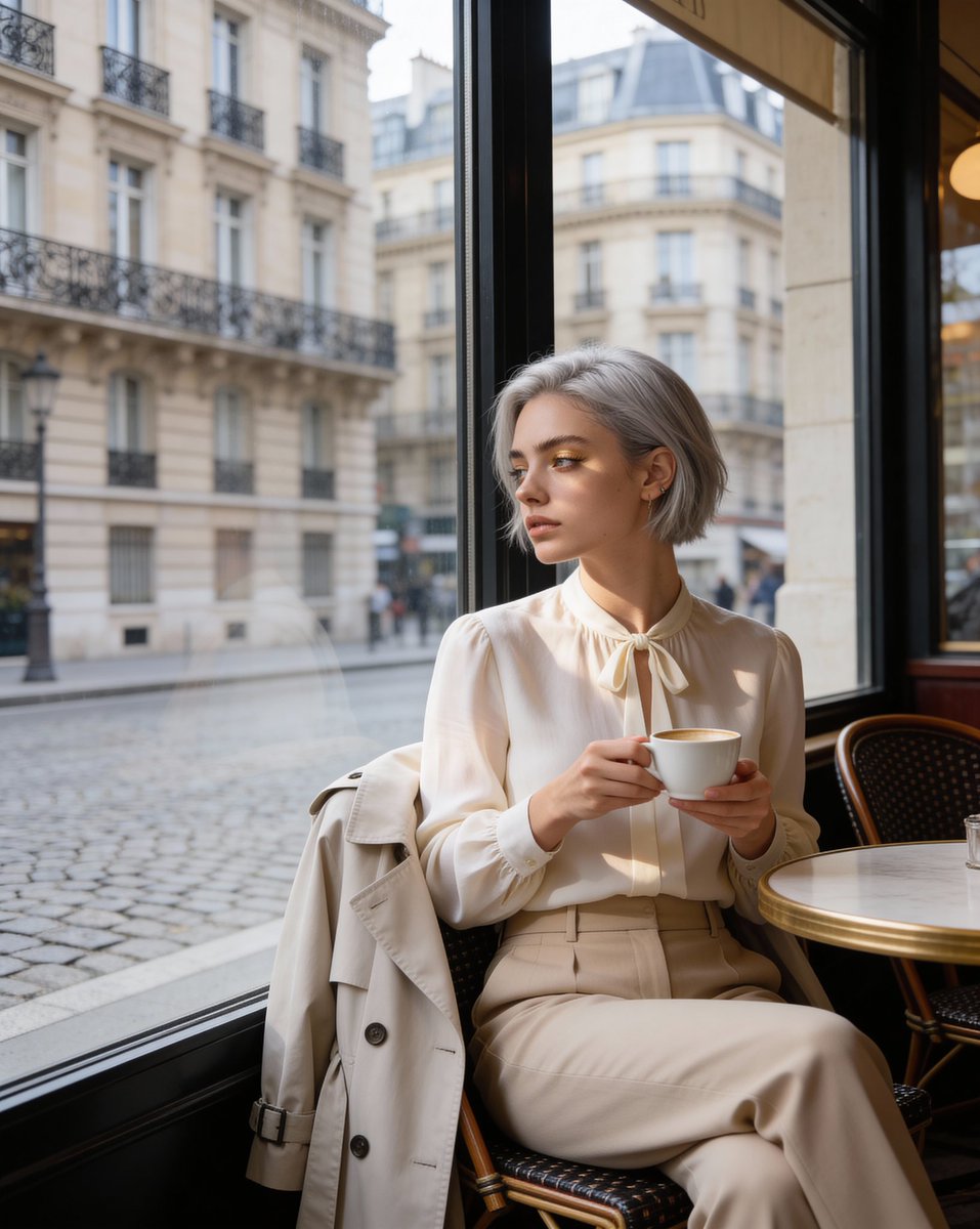一位年轻女士的真实生活肖像,她留着一头短款的银灰色头发,坐在巴黎一家经典咖啡馆的大窗边。她身穿一件柔软的米色衬衫,领口系着精致的蝴蝶结,搭配高腰米色长裤,一件浅色风衣随意地搭在椅背上。她双手捧着一个白色陶瓷咖啡杯,若有所思地凝视窗外,神情平静而优雅。 背景是窗外鹅卵石铺就的巴黎街道,带有铸铁阳台的奥斯曼式建筑,以及背景中柔和模糊的城市细节。自然日光透过窗户洒进来,在她脸上形成柔和的高光和阴影。暖中性色调,极简构图,舒适的欧式咖啡馆氛围,浅景深,真实的肤色和织物质感,电影感生活摄影,杂志美学,50毫米镜头效果,超高分辨率,写实主义。