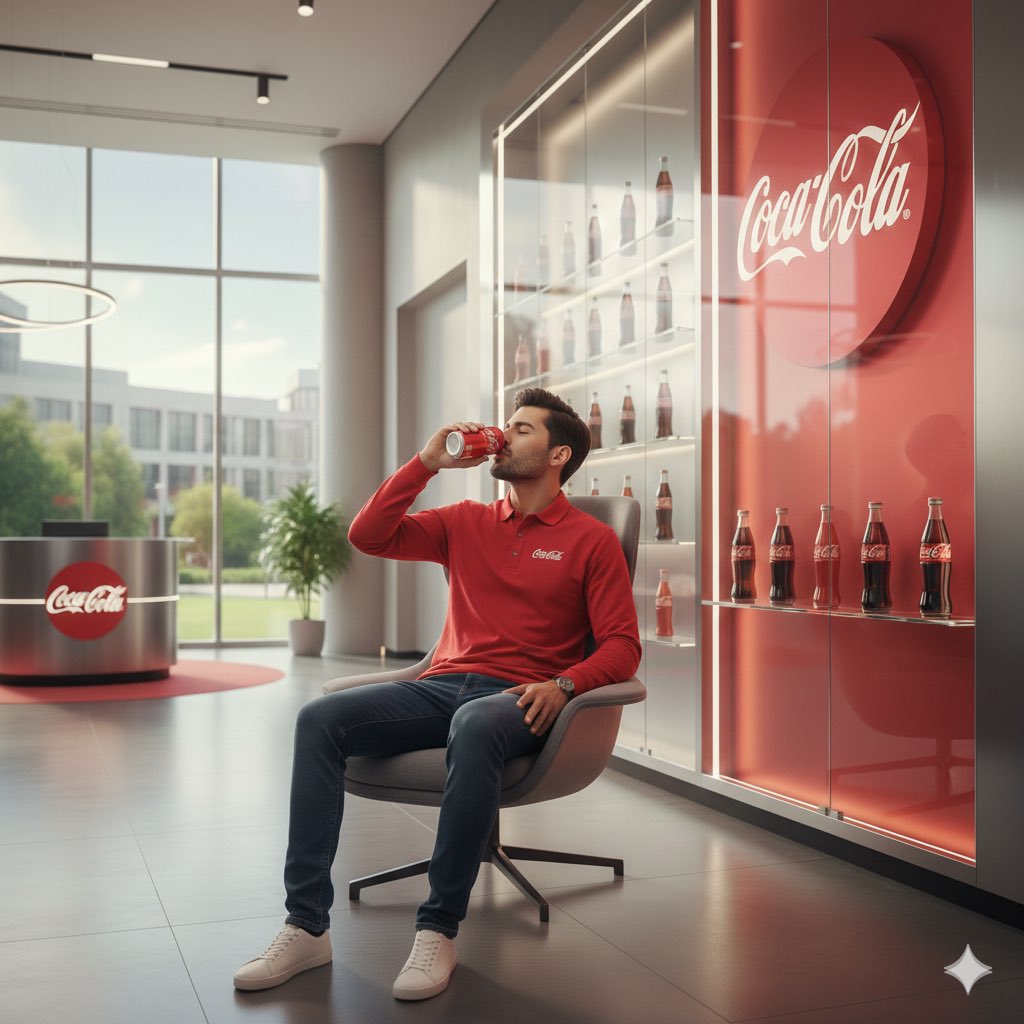 一个写实、高分辨率的产品特写,经典的红色可口可乐罐居中。背景是戏剧性、电影感的深色可乐液体飞溅和悬浮在空中的晶莹冰块。灯光温暖而金色,营造出清新活力的氛围,远处有柔和的散景光斑。 一张高质量、写实的照片,一位 30 多岁的微笑男士,身穿红色 Polo 衫,舒适地坐在时尚的灰色躺椅上,身处可口可乐公司大堂内。他正处于啜饮红色可口可乐罐的瞬间。背景包括红色墙壁上巨大的发光可口可乐标志、装满复古玻璃瓶的玻璃展示柜,以及透过大窗户看到的明亮通风的办公室景色。