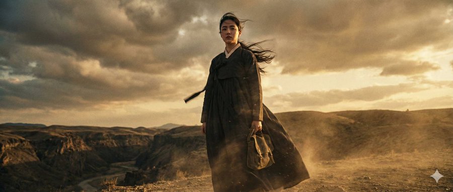 一位二十出头的年轻韩国女性的史诗般历史电影感肖像。 风吹过她的头发和织物,戏剧性的多云天空背景。 黄金时段光照,大尺度氛围,空气中微妙的尘埃。 自信而有力的站姿,坚定的眼神。 宽银幕电影构图,戏剧性对比,高细节,电影剧照质感。