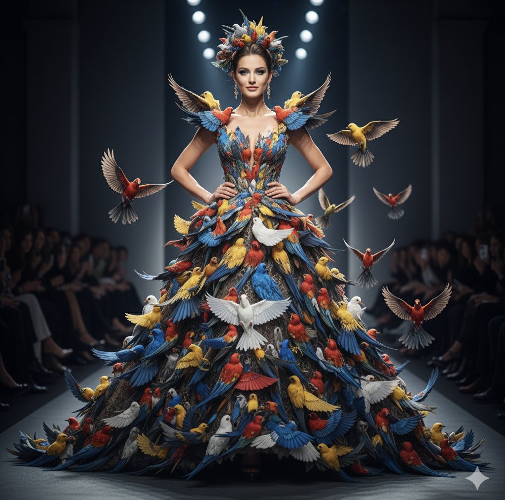 一张令人惊艳的高级时装摄影照片,拍摄了一位身处黑暗极简风格 T 台上的女模特。她穿着一件完全由数百只写实、色彩斑斓的鸟类构成的先锋派礼服,色调包括宝蓝色、明黄色和猩红色。一些鸟儿停在裙子上,而另一些则被捕捉到在半空中飞翔,看起来似乎正在从布料上剥离。模特佩戴着一个精致且高耸的头饰,由羽毛和小鸟组成。灯光具有戏剧性,电影般的聚光灯从上方打在模特身上,在背景中坐着模糊观众的区域投下深深的阴影。整体氛围空灵而宏伟,将羽毛的质感与高端编辑类时尚审美风格相结合。