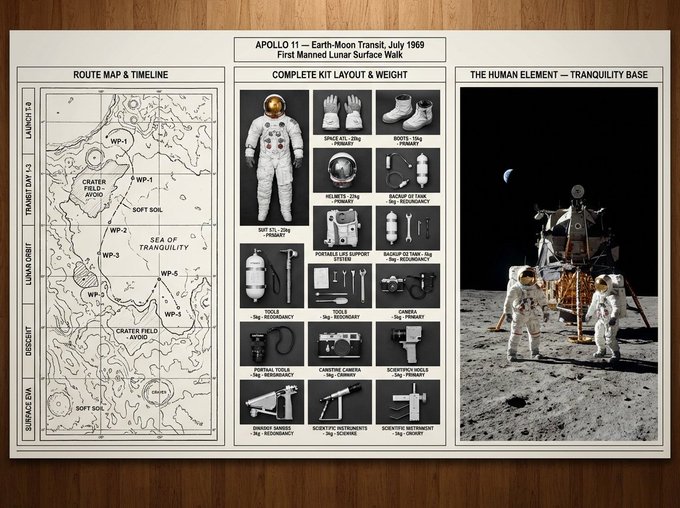 An expedition leader's planning board for [JOURNEY / MISSION] — [DESTINATION / ERA]. Left section: route map with topographical detail, waypoints marked, danger zones annotated, and timeline running along the margin. Center section: complete kit layout, every piece of equipment photographed from above in organized rows, weight and function noted, redundancies highlighted, nothing extraneous. Right section: the expedition in progress or the destination achieved, figures in landscape, scale established, the human element against the immense. Visual style transitions from cartographic precision through utilitarian inventory to epic environmental photography. Title block reading "[EXPEDITION NAME] — [ROUTE], [DATE], [OBJECTIVE]".