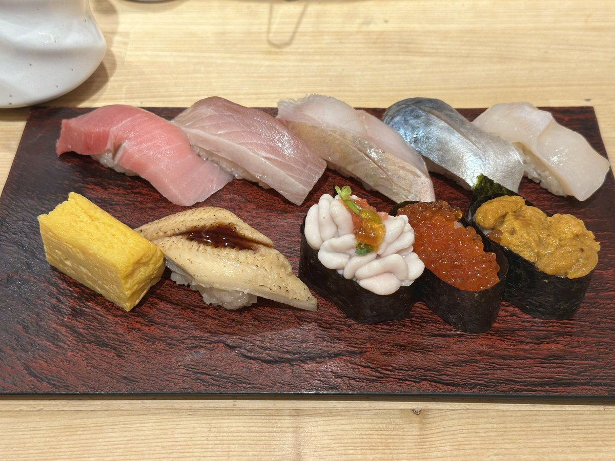 A fairy is eating this sushi with chopsticks. The sushi remains realistic. They are in a sushi restaurant.
