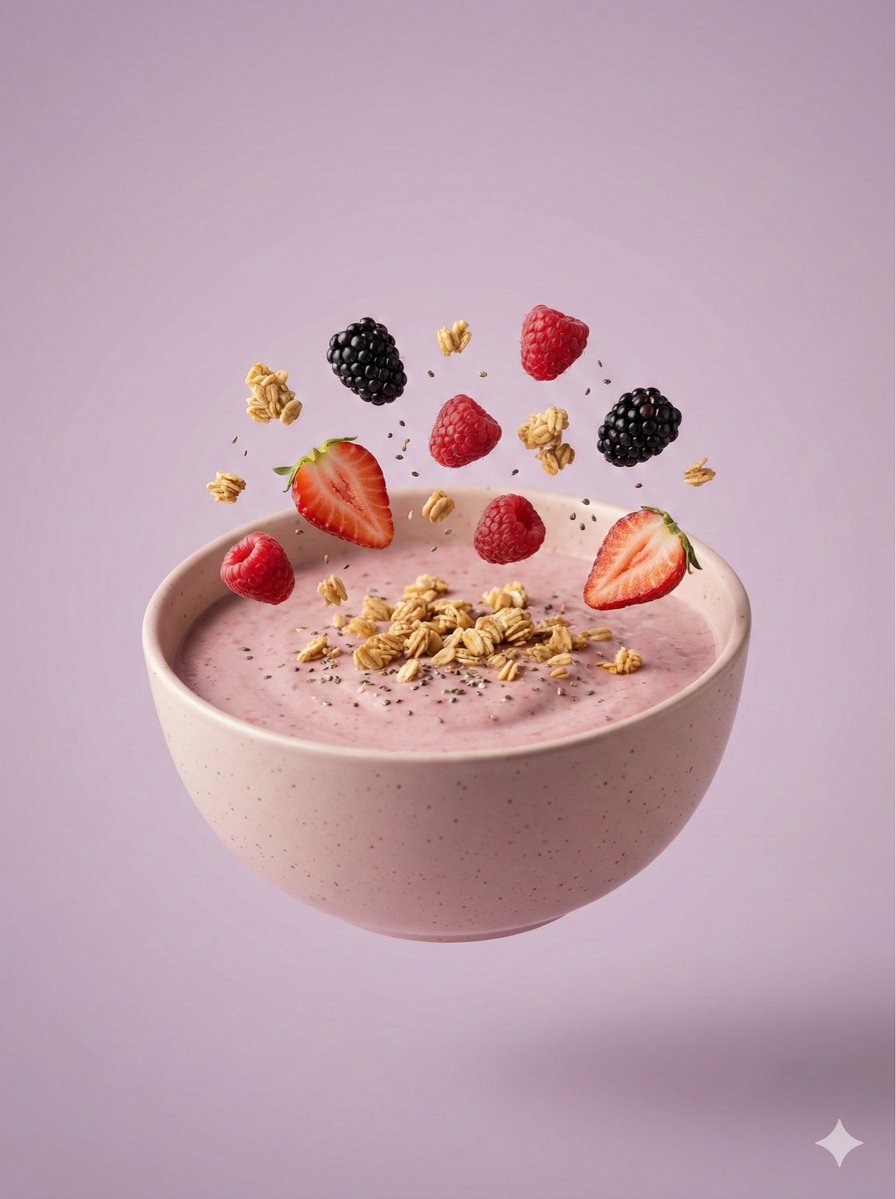 { "resolution": "8K ultra-HD", "aspect_ratio": "3:4 portrait", "image_style": "premium hyper-realistic commercial food photography", "module_2_minimal_floating_smoothie_bowl": { "scene_description": "A calm, minimalist smoothie bowl composition with toppings suspended gently above the surface", "bowl": { "color": "Soft blush ceramic with subtle speckle detailing", "finish": "Velvet-matte surface", "position": "Centrally aligned, floating with visual lightness" }, "base_contents": { "type": "Creamy fruit smoothie", "color": "Pale rose with muted berry undertones", "texture": "Thick, smooth, and uniform" }, "toppings": { "granola": "Golden toasted oat clusters", "seeds": "Fine dark seeds scattered naturally", "fruits": [ "Strawberry halves with visible seed texture", "Whole raspberries", "Plump blackberries" ] }, "motion_effects": { "ingredients": "Toppings hovering softly with minimal movement, evenly spaced" }, "background": { "color": "Muted lavender", "gradient": "Soft pastel gradient with smooth falloff" }, "lighting": "Diffused studio lighting for soft shadows and clean separation", "camera": "High-speed still capture with shallow depth of field" } }{ "resolution": "8K 超高清", "aspect_ratio": "3:4 肖像", "image_style": "高级超写实商业美食摄影", "module_2_minimal_floating_smoothie_bowl": { "scene_description": "一个平静、简约的思慕雪碗构图,配料轻轻悬浮在表面上方", "bowl": { "color": "柔和的腮红陶瓷,带有微妙的斑点细节", "finish": "天鹅绒哑光表面", "position": "居中对齐,视觉上轻盈地漂浮" }, "base_contents": { "type": "奶油水果思慕雪", "color": "淡玫瑰色,带有柔和的浆果底色", "texture": "浓稠、顺滑、均匀" }, "toppings": { "granola": "金黄色烤燕麦簇", "seeds": "细小的深色种子自然散落", "fruits": [ "带有可见籽纹理的草莓半片", "完整覆盆子", "饱满黑莓" ] }, "motion_effects": { "ingredients": "配料轻轻悬浮,动作极小,均匀分布" }, "background": { "color": "柔和的薰衣草色", "gradient": "柔和的粉彩渐变,平滑过渡" }, "lighting": "漫射工作室照明,营造柔和阴影和清晰分离", "camera": "高速静态捕捉,景深较浅" } }
