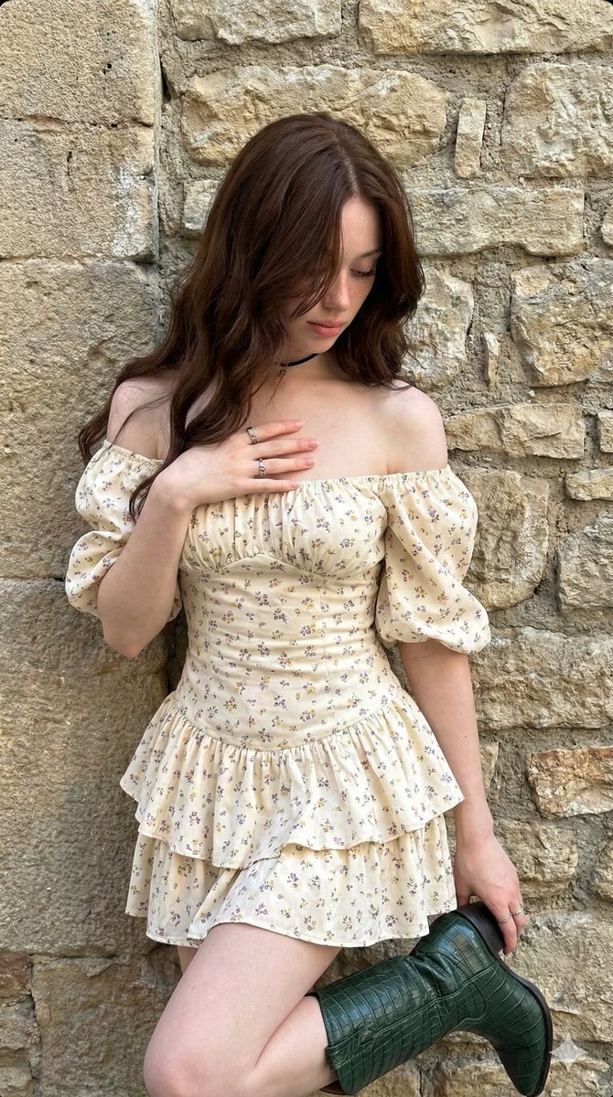 { "prompt_details": { "subject": { "type": "Young woman", "appearance": { "hair": "Long, dark chestnut brown, loose waves, falling over face, messy aesthetic", "skin": "Fair complexion, smooth texture, natural finish", "face": "Looking downward, face partially obscured by hair, introspective expression", "body_type": "Slender, fit" }, "pose": { "stance": "Leaning against a stone wall, body slightly angled", "hands": "Right hand resting gently on chest/neck with fingers splayed, left hand holding a green object (boot) down by her side", "gaze": "Downward, avoiding eye contact" } }, "clothing": { "dress": { "style": "Off-the-shoulder mini dress, cottagecore/boho style", "fabric": "Lightweight cotton or linen blend", "color": "Cream/off-white base", "pattern": "Small, delicate floral print with purple and yellow wildflowers", "details": ["Ruffled tiered skirt", "Puffed short sleeves", "Sweetheart neckline", "Corset-style bodice structure"] }, "accessories": [ "Thin black choker necklace", "Multiple silver rings on fingers", "Red beaded bracelet on left wrist", "Holding a dark green, crocodile-texture cowboy boot" ] }, "environment": { "background": "Textured stone masonry wall", "details": "Large, irregular grey and beige stone blocks, rough texture, natural architectural backdrop", "setting": "Outdoor or semi-outdoor daylight setting" }, "lighting": { "type": "Soft natural daylight", "quality": "Diffused, even illumination, soft shadows", "direction": "Front-lit but soft" }, "styling": { "aesthetic": "Bohemian, chic, feminine, soft grunge undertones", "mood": "Casual, candid, slightly moody, artistic" }, "camera_details": { "shot_type": "Medium shot (thigh-up)", "angle": "Eye-level", "lens": "85mm prime lens for flattering portrait compression", "aperture": "f/2.8 for slight depth of field separation from the wall", "focus": "Sharp focus on the subject and dress texture" }, "technical_specifications": { "quality": "Ultra Photorealistic, 8k resolution, highly detailed", "texture_quality": "High fidelity fabric textures, realistic skin pores, detailed stone masonry", "engine": "Unreal Engine 5 render style or high-end photography" } } }{ "prompt_details": { "subject": { "type": "年轻女性", "appearance": { "hair": "长款、深栗色、波浪松散、垂落脸庞、凌乱美感", "skin": "白皙肤色、光滑质感、自然妆效", "face": "向下看、脸部部分被头发遮挡、内省表情", "body_type": "苗条、健美" }, "pose": { "stance": "靠着石墙、身体略微倾斜", "hands": "右手轻柔地放在胸部/颈部、手指张开;左手在身侧拿着一个绿色物体(靴子)", "gaze": "向下、避免眼神接触" } }, "clothing": { "dress": { "style": "露肩迷你连衣裙、田园风/波西米亚风", "fabric": "轻薄棉麻混纺", "color": "米色/米白色底色", "pattern": "小巧精致的碎花图案、带有紫色和黄色野花", "details": ["荷叶边分层裙摆", "泡泡短袖", "甜心领口", "束身衣式紧身胸衣结构"] }, "accessories": [ "细黑色颈链", "手指上戴有多枚银戒指", "左手腕戴有红色珠串手链", "手持一双深绿色鳄鱼纹牛仔靴" ] }, "environment": { "background": "有纹理的石砌墙", "details": "大块不规则的灰色和米色石块、粗糙质感、自然建筑背景", "setting": "户外或半户外日光场景" }, "lighting": { "type": "柔和自然日光", "quality": "漫射、均匀照明、柔和阴影", "direction": "前置照明但柔和" }, "styling": { "aesthetic": "波西米亚风、时尚、女性化、柔和的垃圾摇滚底蕴", "mood": "休闲、率真、略带忧郁、艺术感" }, "camera_details": { "shot_type": "中景(大腿以上)", "angle": "平视", "lens": "85mm 定焦镜头、用于讨喜的人像压缩", "aperture": "f/2.8、用于与墙壁产生轻微的景深分离", "focus": "主体和连衣裙纹理清晰对焦" }, "technical_specifications": { "quality": "超写实、8k 分辨率、高度细节化", "texture_quality": "高保真织物纹理、逼真的皮肤毛孔、细节丰富的石砌结构", "engine": "Unreal Engine 5 渲染风格或高端摄影" } } }