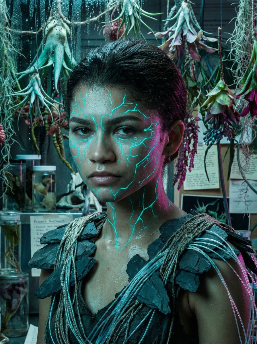 { "vibe_title_en": "Bioluminescent Archivist", "master_prompt": "A hyper-realistic, cinematic close-up of The Protagonist situated in a claustrophobic, cluttered exo-botany research station. The subject looks directly into the lens with a piercing, intense gaze. The skin is textured with hyper-detailed 'practical effect' glowing veins and circuitry patterns that emit a soft cyan luminescence, appearing as applied UV-reactive makeup rather than CGI. Sweat and humidity are visible on the pores. The shoulders are encased in a rough, tactile armor made of slate shards and woven fiber-optic cables. The background is an incredibly busy, dense mess of hanging alien flora, dripping condensation, scattered glass specimen jars, and disorganized research notes, creating a 'lived-in' scientific chaos. Lighting is a dramatic mix of cool cyan ambient bioluminescence and a sharp magenta rim light cutting through the volumetric haze. Shot on a Hasselblad H6D-100c with an 80mm f/1.9 lens to capture the micro-texture of the glowing skin against the cluttered depth.", "meta": { "intent": "Cinematic Portraiture", "priorities": "Photorealism, Texture, Surreal Lighting", "device_profile": "Hasselblad H6D-100c" }, "frame": { "aspect": "4:5", "composition": "Centralized close-up with cluttered depth layering", "layout": "Portrait", "camera_angle": "Eye-level, slightly angled", "tilt_roll_degrees": "0" }, "subject": { "gender": "Female", "identity": "The Protagonist", "demographics": "Universal/Ambiguous", "face": "Intense gaze, hyper-realistic skin texture, wetness from humidity", "hair": "Braided or textured, interwoven with thin wires or vines", "body": "Shoulders visible, posture tense", "expression": "Piercing, mysterious, focused", "pose": "Direct engagement with the lens, slight turn of the head" }, "wardrobe_accessories": { "garments": [ { "item": "Symbiotic Armor", "material": "Slate, Rock, Fiber-optics", "color": "Dark Grey with Cyan accents", "fit": "Structured, Organic fit" } ], "accessories": [ { "item": "Embedded Circuitry Makeup", "color": "Glowing Cyan/Blue", "material": "UV Reactive Paint/Prosthetic", "brand_style": "Sci-Fi Practical Effect" } ] }, "environment": { "setting": "Subterranean Exo-Botany Lab", "surfaces": "Glass, wet metal, organic leaves, paper stacks", "depth": "Shallow depth of field, cluttered bokeh", "atmosphere": "Humid, hazy, dripping wet", "lens_interaction": "Slight condensation on lens, blooming highlights" }, "lighting": { "key": "Soft Cyan Bioluminescence (from subject/plants)", "fill": "Deep Blue ambient", "rim": "Sharp Magenta/Pink kicker light", "shadows": "Deep, crushed blacks for contrast", "color_temperature": "Cool (3200K mixe" } }{ "vibe_title_en": "生物发光档案员", "master_prompt": "一张超现实、电影般的特写镜头,主角身处一个幽闭、杂乱的外星植物研究站。主体直视镜头,眼神锐利而专注。皮肤纹理细致,带有超逼真的“实用特效”发光血管和电路图案,发出柔和的青色光芒,看起来像是涂抹的紫外线反应化妆品,而非电脑特效。毛孔上可见汗水和湿气。肩膀被粗糙、触感十足的盔甲包裹,盔甲由板岩碎片和编织光纤电缆制成。背景是极其繁忙、密集的悬挂外星植物、滴落的冷凝水、散落的玻璃标本罐和杂乱的研究笔记,营造出一种“生活化”的科学混乱感。灯光是冷青色环境生物发光和锐利洋红色轮廓光的戏剧性混合,穿透了体积雾气。使用哈苏 H6D-100c 相机和 80mm f/1.9 镜头拍摄,以捕捉发光皮肤在杂乱景深中的微观纹理。", "meta": { "intent": "电影肖像", "priorities": "超写实、纹理、超现实光照", "device_profile": "哈苏 H6D-100c" }, "frame": { "aspect": "4:5", "composition": "中心特写,具有杂乱的深度分层", "layout": "纵向", "camera_angle": "视平线,略微倾斜", "tilt_roll_degrees": "0" }, "subject": { "gender": "女性", "identity": "主角", "demographics": "通用/模糊", "face": "锐利凝视,超写实皮肤纹理,因湿气而湿润", "hair": "编织或有纹理,与细线或藤蔓交织", "body": "肩膀可见,姿势紧张", "expression": "锐利、神秘、专注", "pose": "直接与镜头互动,头部略微转动" }, "wardrobe_accessories": { "garments": [ { "item": "共生盔甲", "material": "板岩、岩石、光纤", "color": "深灰色带青色点缀", "fit": "结构化、有机贴合" } ], "accessories": [ { "item": "嵌入式电路化妆", "color": "{argument name=\"makeup color\" default=\"发光青色/蓝色\"}", "material": "紫外线反应涂料/假体", "brand_style": "科幻实用特效" } ] }, "environment": { "setting": "地下外星植物实验室", "surfaces": "玻璃、湿金属、有机叶片、纸堆", "depth": "浅景深,杂乱的散景", "atmosphere": "潮湿、朦胧、滴水", "lens_interaction": "镜头上略有冷凝水,高光溢出" }, "lighting": { "key": "柔和青色生物发光(来自主体/植物)", "fill": "深蓝色环境光", "rim": "锐利洋红色/粉色边缘光", "shadows": "深邃、压暗的黑色以形成对比", "color_temperature": "冷色调(3200K 混合)" } }