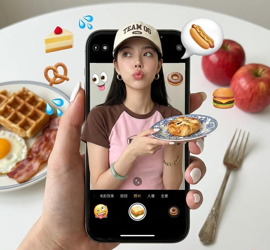 一幅超现实、极致清晰的现代智能手机拍摄照片,以其数字清晰度为特征,捕捉到一个充满活力的平面俯拍构图。一只手佩戴着金色链条手链,指甲修剪整齐并涂有白色指甲油,手握一部装在透明保护壳中的 iPhone 15 Pro,置于浅色表面中央。手机屏幕显示相机应用界面,包含中文文本选项:“电影效果”、“视频”、“照片”、“人像”和“全景”,其中“照片”被高亮,左下角还有一张小预览缩略图。从手机屏幕中浮现出一个主体,摆出俏皮姿势,向上并向右侧看,双手前伸,托着一只蓝色花纹的小盘子,盘中放着一条麻花甜面包,表面撒有芝麻,夹有红色馅料。主体头戴浅米色棒球帽,帽上绣有“TEAM OG”棕色大写字母,身穿棕色短袖上衣,内搭浅粉色衬衫,佩戴金色圈圈耳环。一只手腕上可见一只绿色玉质手镯。头发为长直黑发,自然垂落于肩部和胸前,具有自然蓬松感。背景为白色表面,一个白色盘子带有红色边缘,盛放着一块华夫饼,上面放着一个煎蛋和培根,还有两个鲜艳的红色苹果。左上侧放置一把金属叉,配有白色手柄。场景中叠加了各种彩色表情符号和插画,包括手机上方两个蓝色汗滴、一朵白色云朵配热狗、一片黄色蛋糕、一个椒盐卷饼、一个汉堡、一个三明治、一双吐舌头的卡通眼睛、一个甜甜圈、一个小黑色电话图标和一个白色杯子图标。还有社交媒体文本叠加层。