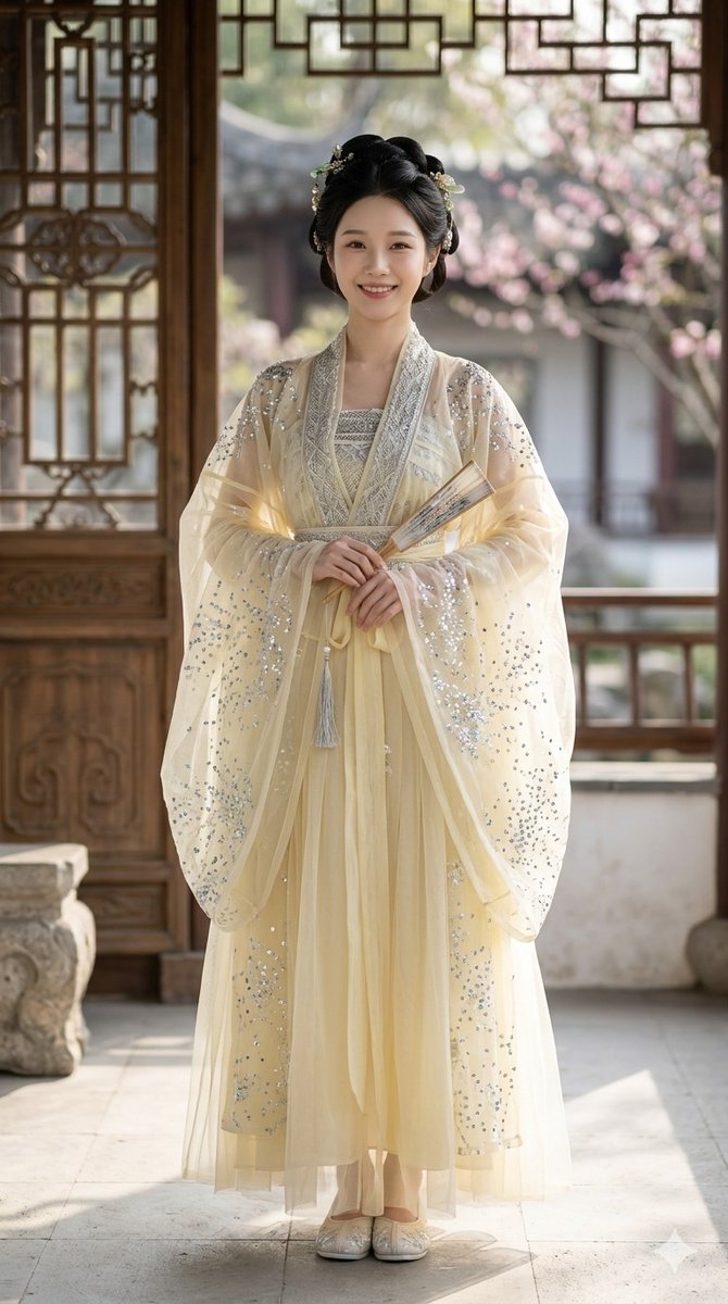 服裝細節: 模特兒身穿一套精緻的淡冰藍色齊胸襦裙,採用多層輕盈的薄紗和絲綢歐根紗材質制成。其寬大的、半透明的廣袖上點綴著如繁星般微小的銀色和淺藍色亮片刺繡,在光線下閃爍(具有銀河般的夢幻感)。抹胸位置有複雜的銀色蕾絲和編織紋理細節,腰帶自然垂落。