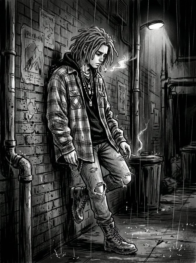 剧画漫画风格,90年代垃圾摇滚时尚,忧郁的模特留着凌乱的脏辫靠在墙上,穿着特大号法兰绒衬衫,破洞牛仔裤,军靴,多层项链,辰巳嘉裕风格,粗砺的质感,重阴影,原始情感,缭绕的烟圈,雨滴效果,粗糙的素描线条,漫画艺术,中景视图,具有强烈垂直线的偏离中心构图,在昏暗的后巷中,忧郁的垃圾摇滚配色方案,带有单一刺眼聚光灯的低调照明,深邃的阴影