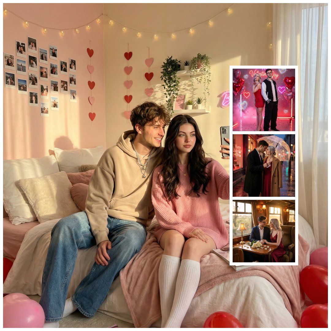 在午后黄金时段,在一个舒适、有格调的卧室里,营造一个超现实、时尚的 Z 世代情人节场景。 房间里有柔和的马卡龙色墙壁、小彩灯、心形墙面装饰、拍立得照片、毛绒枕头和散落的时尚杂志。自然阳光透过薄纱窗帘洒进来,给整个空间镀上了一层温暖的金色光芒。 一对时尚的年轻情侣随意地坐在铺着白色和腮红毯子的凌乱床上。 男士穿着休闲街头服饰——宽松的连帽衫、宽松的牛仔裤、叠戴的项链,柔软的卷发略显凌乱。 女士穿着一件宽松的粉色毛衣,搭配及膝袜,化着自然的露水感妆容,涂着亮泽的唇彩,头发是柔和的波浪卷。 她举着手机,仿佛正在拍摄一个“和我一起准备——情人节特辑”的视频,而他则从她身后探过身来,对着镜头俏皮地笑着。他们看起来放松、调情且真实——既自然又富有电影感。 心形气球散落在地板上,墙上挂着一个发光的粉色 LED 标牌,上面写着“Be Mine”。 灯光:温暖自然的黄金时段光线 + 柔和的小彩灯光芒。 镜头:35mm 生活镜头,浅景深,奶油般柔和的背景虚化。 风格:超细节、柔和的皮肤纹理、舒适的网红美学、TikTok 氛围、浪漫而现代、真实的杂志摄影。