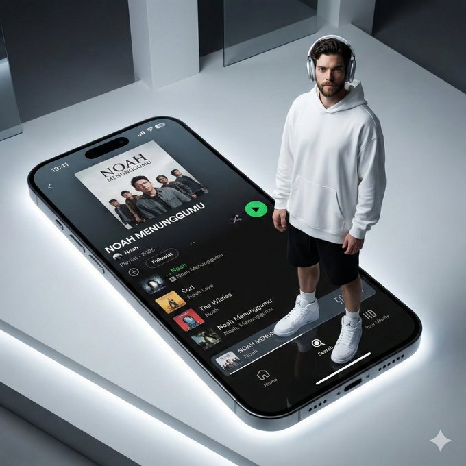Create a sleek, modern photo of image (based on the uploaded reference), standing confidently on a giant iphone 16 screen. the screen displays a spotify playlist featuring the song "NOAH MENUNGGUMU." She's wearing 2025 airpods max, an oversized white hoodie-style shirt, black shorts, and crisp white air jordans. the scene is shot from a high top-down angle to highlight the massive scale of the phone. the vibe is minimal, stylish, and futuristic.