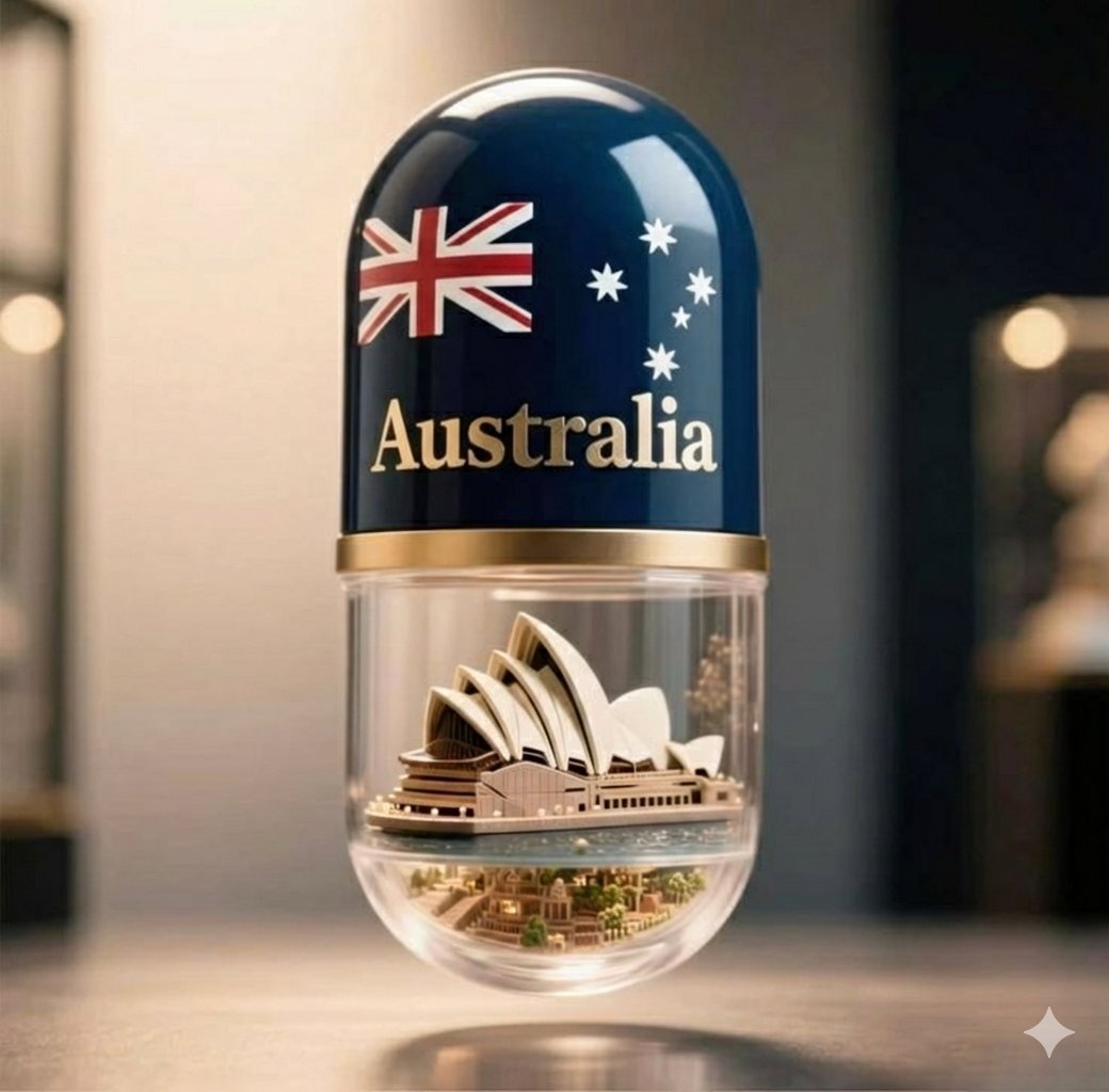 一个高质量的 3D 数字渲染图,展示了一颗巨大的药丸胶囊垂直立着。上半部分是实心海军蓝色,带有光泽感,上面有美国国旗和用优雅的金色衬线字体书写的“America”字样。下半部分由透明玻璃制成,里面有一个高度精细的白宫微缩 3D 模型,模型置于蓝色水面和微型园林绿化的基座上。胶囊中间有一圈细细的金色金属环将两部分隔开。工作室打光,柔和的焦外虚化背景,超逼真的纹理,8k 分辨率。