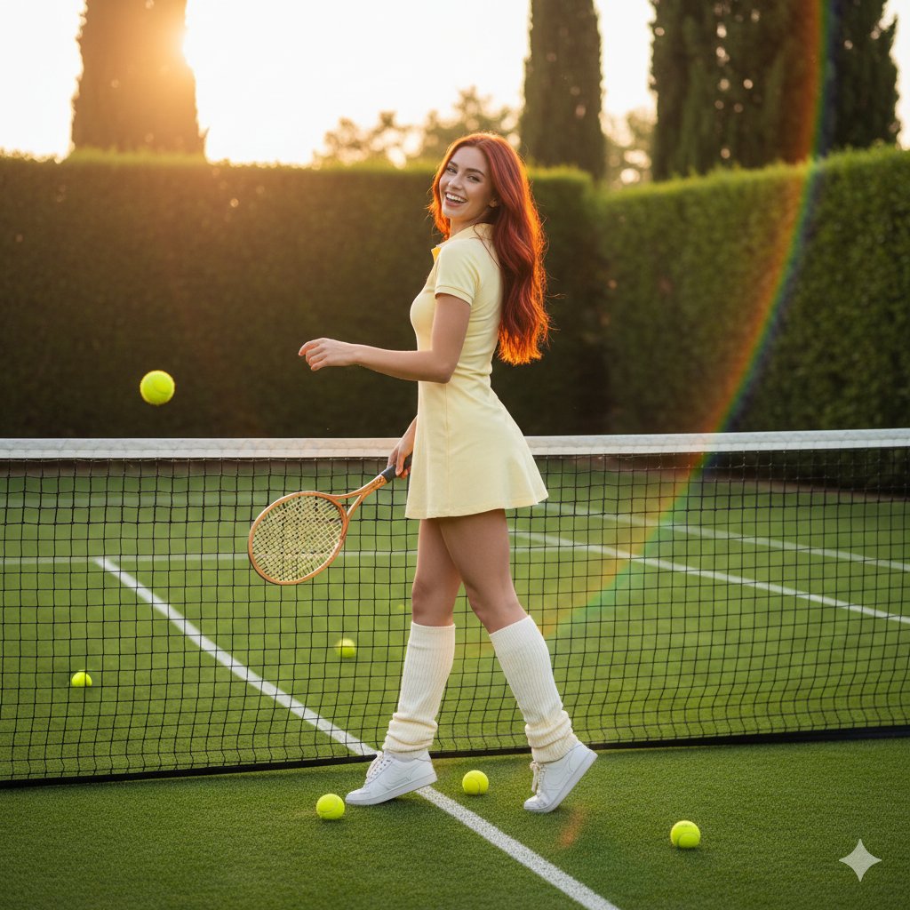 { "prompt": "Tennis lifestyle photo of Luna, a young woman with long VIBRANT SOLID RED wavy hair, giving a big joyful smile while looking over her shoulder at the camera. She is wearing a pale yellow tennis polo dress with a collar and short sleeves. She is leaning on a white tennis net, holding a racket. Her 165cm and 55kg slender frame is complemented by cream white slouchy leg warmers and white sneakers. The setting is a lush green grass tennis court with yellow tennis balls scattered on the ground and some floating in the air. Tall green hedges and cypress trees in the background under golden hour sunset sunlight with warm lens flares. Playful athletic lifestyle content, sporty preppy aesthetic.", "negative_prompt": "tattoos, ink, body art, blonde hair, brown hair, black hair, thick legs, muscular build, heavy build, indoor, serious expression, dark lighting, winter, harsh shadows, studio backdrop, plastic skin, airbrushed.", "style": "tennis lifestyle photography, sporty preppy aesthetic, golden hour outdoor, playful athletic content", "aspect_ratio": "3:4", "character_identity": { "name": "Luna", "hair": "Long, vibrant crimson red, soft wavy texture, flowing naturally in the evening breeze", "eyes": "Piercing emerald green, sparkling with joy", "skin": "Luminous fair porcelain skin, flawless, ABSOLUTELY NO TATTOOS (asla dövme yok)", "body_specs": "165cm height, 55kg weight, slender and fit hourglass, elegant and athletic posture" }, "camera_and_lighting": { "angle": "Slightly behind and to the side, capturing the over-shoulder look back", "lighting": "Golden hour sunset, warm backlight creating a halo effect on her red hair, soft lens flares", "framing": "Full body shot showing the pose and the court setting" }, "wardrobe_details": { "outfit": "Pale yellow tennis polo dress (pale yellow contrast with red hair), cream white slouchy leg warmers, clean white sneakers", "accessory": "Classic tennis racket held naturally" }, "environment": { "location": "Private grass tennis court", "elements": "Yellow tennis balls, white net, green hedges, cypress trees, golden summer atmosphere" } }{ "prompt": "网球生活方式照片,人物是 {argument name=\"character name\" default=\"Luna\"},一位年轻女性,留着充满活力、纯粹的 {argument name=\"hair color\" default=\"红色\"} 波浪长发,她正对着镜头,越过肩膀,露出灿烂愉悦的笑容。她穿着一件淡黄色翻领短袖网球连衣裙。她靠在白色网球网上,手里拿着球拍。她 165 厘米高,55 公斤重,身材苗条,搭配米白色宽松护腿和白色运动鞋。场景是一个郁郁葱葱的绿色草地网球场,地上散落着一些黄色网球,空中也漂浮着一些。背景是高大的绿色树篱和柏树,在金色日落余晖下,伴随着温暖的镜头光晕。活泼的运动生活方式内容,运动学院风美学。", "negative_prompt": "纹身、墨水、人体艺术、金发、棕发、黑发、粗腿、肌肉发达、体格魁梧、室内、严肃表情、光线昏暗、冬季、刺眼阴影、影棚背景、塑料皮肤、修图过度。", "style": "网球生活方式摄影、运动学院风美学、金色日落户外、活泼的运动内容", "aspect_ratio": "3:4", "character_identity": { "name": "Luna", "hair": "长而鲜艳的深红色,柔软的波浪纹理,在傍晚微风中自然飘逸", "eyes": "炯炯有神的翠绿色,闪烁着喜悦", "skin": "光泽白皙的瓷器般肌肤,完美无瑕,绝对没有纹身 (asla dövme yok)", "body_specs": "身高 165 厘米,体重 55 公斤,苗条健美的沙漏型身材,优雅而富有运动感的姿态" }, "camera_and_lighting": { "angle": "略微靠后并偏向一侧,捕捉她回眸的瞬间", "lighting": "金色日落时分,温暖的逆光在她红发上形成光晕效果,柔和的镜头光晕", "framing": "全身照,展示姿势和球场环境" }, "wardrobe_details": { "outfit": "淡黄色网球 polo 连衣裙(淡黄色与红发形成对比),米白色宽松护腿,干净的白色运动鞋", "accessory": "自然握持的经典网球拍" }, "environment": { "location": "私人草地网球场", "elements": "黄色网球、白色球网、绿色树篱、柏树、金色夏日氛围" } }