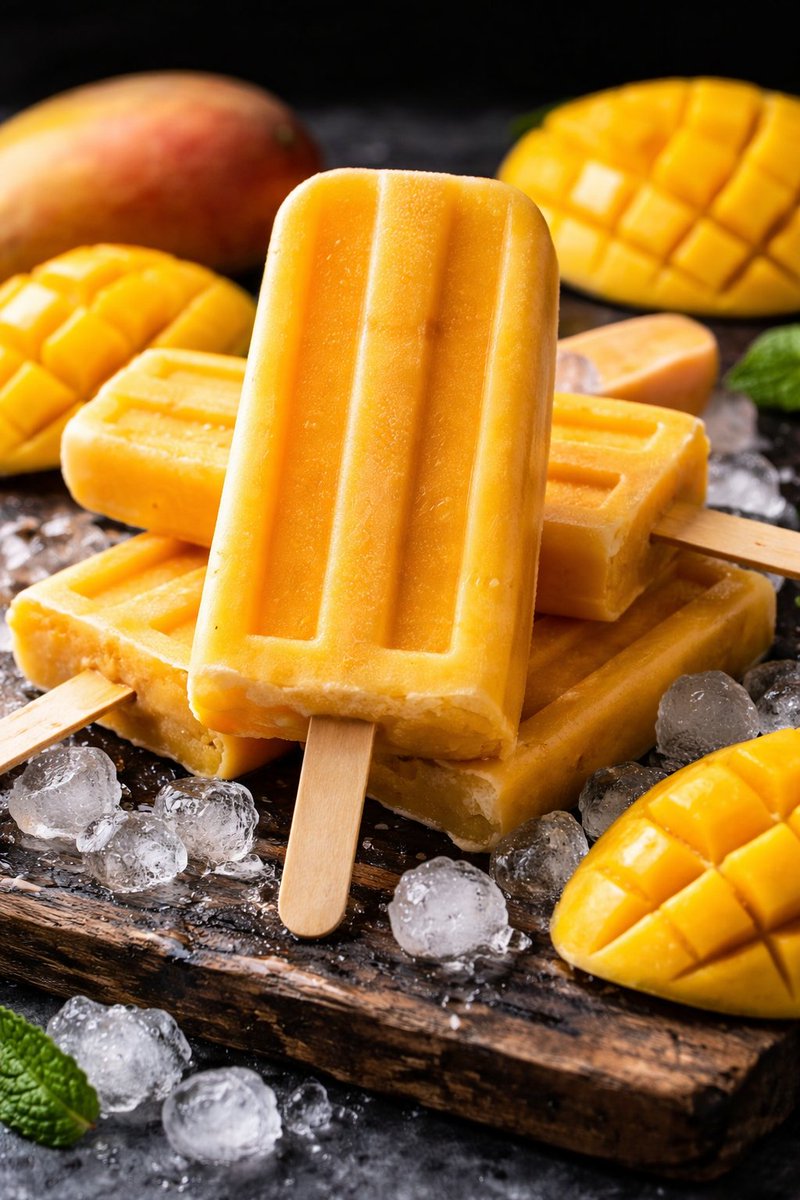{ "image_type": "food photography", "resolution_target": "8K ultra high definition", "aspect_ratio": "3:4 vertical", "primary_subject": { "object": "frozen popsicles", "count": "multiple", "shape": "rectangular with three vertical grooves on the front face", "edges": "slightly rounded corners", "surface_texture": "smooth frozen surface with fine ice crystals and light condensation", "color": "rich mango yellow to golden orange gradient", "material_appearance": "dense frozen puree-like consistency", "stick": { "material": "light-colored wooden stick", "shape": "flat, rectangular with rounded edges", "visibility": "clearly visible on foreground and background popsicles" } }, "foreground_composition": { "main_popsicle": { "orientation": "upright, vertical", "position": "center foreground", "details": "sharp focus, visible frost texture, smooth grooves, clean edges" } }, "secondary_popsicles": { "positioning": "stacked and layered behind the main popsicle", "orientation": "horizontal and slightly angled", "depth": "partially overlapping each other", "focus": "slightly softer focus than the main subject" }, "supporting_elements": { "ice_cubes": { "appearance": "irregular crushed ice pieces", "transparency": "semi-transparent with light reflections", "placement": "scattered around popsicles on wooden surface" }, "mango_fruit": { "whole_mango": { "visibility": "present in background", "color": "yellow-orange with subtle red blush", "focus": "soft focus" }, "cut_mango": { "style": "cross-hatched cubes still attached to mango skin", "color": "bright saturated yellow", "placement": "background and side areas" } }, "mint_leaves": { "presence": "small quantity", "color": "fresh green", "placement": "near ice and wooden surface", "detail_level": "visible veins, slightly glossy surface" } }, "surface_and_base": { "base_object": "rustic wooden board", "texture": "rough, weathered wood grain", "color": "dark brown with natural imperfections", "moisture": "wet patches from melting ice" }, "background": { "color": "dark, nearly black", "style": "studio-style backdrop", "depth_of_field": "shallow depth, background softly blurred", "distractions": "none visible" }, "lighting": { "type": "soft studio lighting", "direction": "angled from front and slightly above", "highlights": "gentle highlights on frozen surfaces and ice", "shadows": "soft, controlled shadows under popsicles and ice", "contrast": "moderate, natural-looking" }, "color_palette": { "dominant_colors": [ "mango yellow", "golden orange" ], "secondary_colors": [ "dark brown",{ "image_type": "美食摄影", "resolution_target": "8K 超高清", "aspect_ratio": "3:4 垂直", "primary_subject": { "object": "冷冻冰棒", "count": "多个", "shape": "长方形,正面有三条垂直凹槽", "edges": "边角略微圆润", "surface_texture": "光滑的冷冻表面,带有细小的冰晶和轻微的冷凝水", "color": "浓郁的芒果黄到金橙色渐变", "material_appearance": "浓稠的冷冻果泥状质地", "stick": { "material": "浅色木棒", "shape": "扁平长方形,边缘圆润", "visibility": "前景和背景冰棒上的木棒清晰可见" } }, "foreground_composition": { "main_popsicle": { "orientation": "直立,垂直", "position": "前景中央", "details": "对焦清晰,可见霜冻纹理,凹槽光滑,边缘干净" } }, "secondary_popsicles": { "positioning": "主冰棒后面堆叠和分层", "orientation": "水平并略微倾斜", "depth": "部分相互重叠", "focus": "焦点比主要拍摄对象略柔和" } }, "supporting_elements": { "ice_cubes": { "appearance": "不规则的碎冰块", "transparency": "半透明,带有反光", "placement": "散落在木质表面冰棒周围" }, "mango_fruit": { "whole_mango": { "visibility": "出现在背景中", "color": "黄橙色,带有微妙的红色晕染", "focus": "柔和对焦" }, "cut_mango": { "style": "切成网格状的小方块,仍附着在芒果皮上", "color": "鲜艳饱和的黄色", "placement": "背景和侧面区域" } }, "mint_leaves": { "presence": "少量", "color": "新鲜的绿色", "placement": "靠近冰块和木质表面", "detail_level": "可见叶脉,表面略带光泽" } }, "surface_and_base": { "base_object": "质朴的木板", "texture": "粗糙,风化的木纹", "color": "深棕色,带有天然瑕疵", "moisture": "融化的冰块留下的湿痕" }, "background": { "color": "深色,近乎黑色", "style": "影棚式背景", "depth_of_field": "景深较浅,背景柔和模糊", "distractions": "无明显干扰物" }, "lighting": { "type": "柔和的影棚灯光", "direction": "从前方和略上方倾斜照射", "highlights": "冷冻表面和冰块上的柔和高光", "shadows": "冰棒和冰块下方的柔和、受控阴影", "contrast": "适中,自然感" }, "color_palette": { "dominant_colors": [ "芒果黄", "金橙色" ], "secondary_colors": [ "深棕色", "新鲜绿色", "冰白色" ] } }