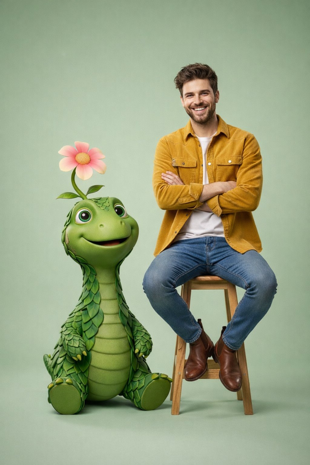 "pose": "Standing beside creature, smiling naturally, one hand resting on the character’s head",