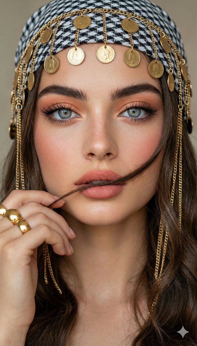 将上传的图片转换为一位特写肖像姿势的惊艳女性。她用手轻抚一缕波浪状的棕色头发,置于唇前。她拥有迷人的灰蓝色眼睛,柔和的魅力妆容,包括桃色眼影、浓密睫毛、大胆眼线、玫瑰色腮红和桃粉色哑光唇。她戴着一条黑白图案的头巾,上面装饰着悬挂的金色硬币和链条。长长的金链耳环勾勒出她的脸庞。她的手指上戴着一枚粗大的金戒指,当她的手抬到脸旁时清晰可见。背景是中性柔和的米色调,模糊处理。超现实主义,8K 细节,眼睛锐利聚焦,皮肤纹理光滑,电影级光线。面部特征保持不变。