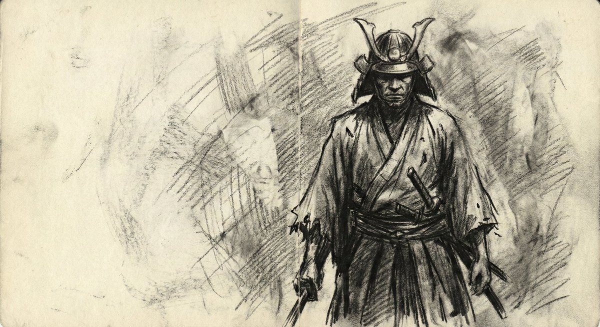 A charcoal sketch of a subject, raw and textured with expressive shading and bold linework. The background is filled with smudged gradients and sketchbook marks, giving it a gritty, unrefined elegance.