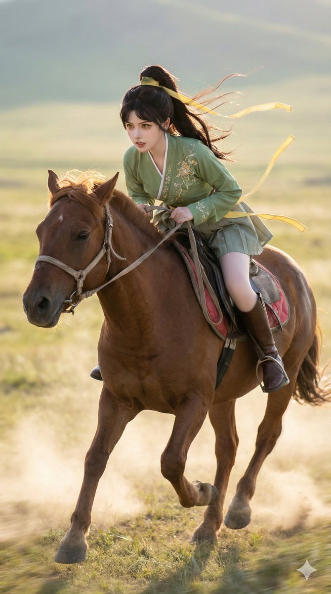 最佳品质,杰作,精美照片,一位美丽的cosplayer在草原上全速策马飞驰。她穿着高品质的现代汉服(豆绿色交领上衣带银绣,短款百褶裙,可见皮质马靴)。cosplay妆容,巨大琥珀色眼睛(彩色美瞳),光泽红唇,无瑕喷绘瓷白肌肤。扎着高马尾假发,黄色丝带在风中狂舞。动作:前倾冲刺,低伏身体,紧握缰绳,肾上腺素飙升。眼神:坚定地凝视地平线,不看镜头。动态:发丝狂舞,蹄边尘土飞扬,背景草地动态模糊。光线:黄金时段光,柔和边缘光,鲜艳色彩。风格:2.5D美学,打破次元壁,纯净无瑕。镜头:85mm人像镜头,摇摄效果,面部锐利对焦,8K分辨率。--ar 9:16