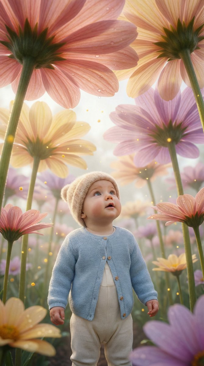 超现实主义概念肖像,描绘了一个可爱的婴儿站在巨大的花田中,花朵高耸如树,花瓣比雨伞还宽。婴儿穿着柔和的马卡龙色系服装(小开衫和连体衣),戴着舒适的帽子,脸颊圆润,眼睛明亮好奇,表情天真梦幻,敬畏地向上凝视。 巨大的花朵细节丰富,花瓣纹理逼真,露珠晶莹,发光的金色花粉如尘埃般在空中飘浮。一些花瓣轻轻地向婴儿弯曲,仿佛在保护他们,在上方形成一个神奇的华盖。柔和的阳光穿过高耸的花茎倾泻而下,形成体积光束和朦胧的童话般薄雾。 电影般的广角构图,景深较浅,婴儿的脸和附近的花瓣对焦超清晰,远处的花朵则虚化成柔和的焦外散景。温暖的马卡龙色调,自然的婴儿皮肤纹理,编辑级奇幻摄影风格,超现实主义,8K 画质,垂直构图,充满魔幻而纯真的氛围。