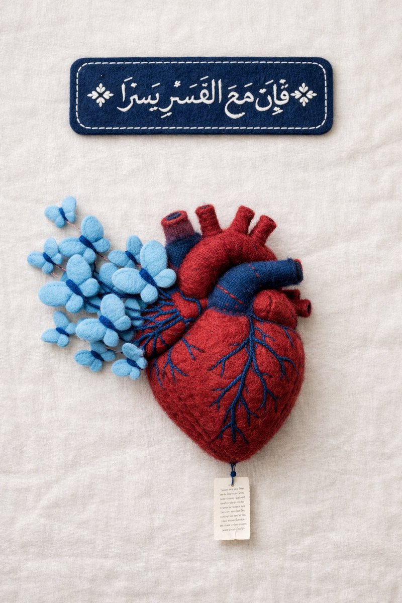 { "image_type": "fine art textile photography", "editing_style": "AI-edited, ultra-clean, high-detail", "resolution": "8K", "aspect_ratio": "3:4", "orientation": "vertical", "camera_view": "top-down flat lay", "lighting": { "type": "soft diffused light", "direction": "even overhead lighting", "shadows": "very soft, minimal, natural fabric shadows", "contrast": "low to medium contrast" }, "background": { "material": "light off-white fabric", "texture": "soft, slightly wrinkled textile surface", "pattern": "no pattern, uniform fabric", "color": "warm off-white" }, "top_element": { "object_type": "rectangular felt fabric plaque", "position": "top center", "orientation": "horizontal", "material": "felt or wool textile", "color": "deep navy blue", "border": { "style": "stitched embroidery", "color": "white", "shape": "rectangular with rounded corners" }, "text": { "language": "Arabic", "content": "فَإِنَّ مَعَ الْعُسْرِ يُسْرًا", "style": "embroidered calligraphy", "color": "white", "alignment": "centered", "decorative_elements": { "left_symbol": "small floral or ornamental motif", "right_symbol": "small floral or ornamental motif", "color": "white" } }, "texture_detail": "visible fiber strands, soft felt fuzz" }, "main_subject": { "object_type": "anatomical human heart sculpture", "material": "felted wool or textile fiber", "position": "center lower half of image", "scale": "medium-large relative to frame", "color": { "primary": "deep red", "secondary": "dark blue thread detailing" }, "texture": { "surface": "soft, fibrous, hand-felted texture", "stitching": "visible seams and thread work" }, "anatomy_details": { "heart_shape": "realistic anatomical form", "arteries_and_veins": { "style": "stitched lines", "color": "dark blue", "distribution": "branching across heart surface" } } }, "butterfly_elements": { "object_type": "fabric butterflies", "material": "felt or wool", "color": "light blue", "texture": "soft, plush textile", "distribution": { "location": "emerging from left side of heart", "density": "clustered, layered", "direction": "flowing outward to the left" }, "attachment": "connected visually to heart veins", "sizes": "small to medium, slightly varied", "details": { "wings": "rounded, folded felt shapes", "centers": "darker blue knot or stitch" } }, "lower_detail": { "object_type": "hanging paper strip", "position": "attached at bottom of heart", "material": "thin paper", "color": "off-white", "text": { "presence": "yes", "legibility": "very small, not readable clearly", "color": "dark gray or bla" } } }{ "image_type": "艺术纺织品摄影", "editing_style": "AI 编辑,超干净,高细节", "resolution": "8K", "aspect_ratio": "3:4", "orientation": "垂直", "camera_view": "俯视平铺", "lighting": { "type": "柔和漫射光", "direction": "均匀的顶灯", "shadows": "非常柔和,极少,自然的织物阴影", "contrast": "低到中等对比度" }, "background": { "material": "浅米色织物", "texture": "柔软,略带褶皱的纺织品表面", "pattern": "无图案,均匀织物", "color": "暖米色" }, "top_element": { "object_type": "矩形毛毡布匾", "position": "顶部中央", "orientation": "水平", "material": "毛毡或羊毛纺织品", "color": "深海军蓝", "border": { "style": "刺绣缝线", "color": "白色", "shape": "带圆角的矩形" }, "text": { "language": "阿拉伯语", "content": "فَإِنَّ مَعَ الْعُسْرِ يُسْرًا", "style": "刺绣书法", "color": "白色", "alignment": "居中", "decorative_elements": { "left_symbol": "小型花卉或装饰图案", "right_symbol": "小型花卉或装饰图案", "color": "白色" } }, "texture_detail": "可见的纤维股,柔软的毛毡绒毛" }, "main_subject": { "object_type": "解剖学人体心脏雕塑", "material": "毛毡羊毛或纺织纤维", "position": "图像下半部分的中央", "scale": "相对于画面中等偏大", "color": { "primary": "深红色", "secondary": "深蓝色线细节" }, "texture": { "surface": "柔软,纤维状,手工毛毡质感", "stitching": "可见的缝线和线迹" }, "anatomy_details": { "heart_shape": "逼真的解剖形态", "arteries_and_veins": { "style": "缝线", "color": "深蓝色", "distribution": "分支遍布心脏表面" } } }, "butterfly_elements": { "object_type": "织物蝴蝶", "material": "毛毡或羊毛", "color": "浅蓝色", "texture": "柔软,毛绒纺织品", "distribution": { "location": "从心脏左侧涌出", "density": "簇状,分层", "direction": "向左外流" }, "attachment": "视觉上与心脏静脉相连", "sizes": "小到中等,略有差异", "details": { "wings": "圆形,折叠的毛毡形状", "centers": "深蓝色结或缝线" } }, "lower_detail": { "object_type": "悬挂的纸条", "position": "附着在心脏底部", "material": "薄纸", "color": "米白色", "text": { "presence": "有", "legibility": "非常小,看不清楚", "color": "深灰色或黑色" } } }