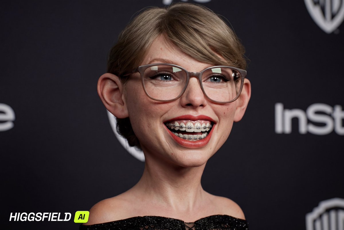 基于所提供照片的超逼真 3D 漫画,面部极度夸张,脖子拉长,耳朵和眼镜超大,咧嘴大笑,表情丰富,牙齿和金属牙套细节超精细,皮肤纹理超精细,毛孔和细纹清晰可见,眼睛光泽反光,眼神锐利,电影级工作室布光,8k 分辨率,虚幻引擎 5 渲染风格,锐利对焦,发型精细,高对比度和鲜明细节。