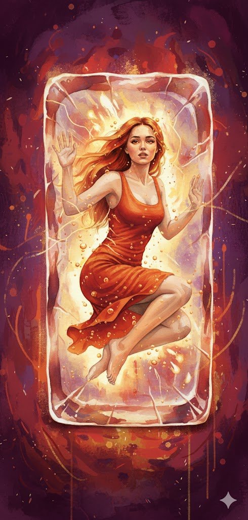 一幅超细节的、超现实水彩风格数字绘画:一位年轻女子被困在一整块高大的透明矩形冰块内部。冰块边缘粗糙龟裂,表面布满霜花纹理,可见清晰的分层与裂缝。女子仿佛悬浮于水中,周身环绕着数十颗漂浮的气泡。她身穿一件无袖、浅蓝色、贴身的连衣裙,裙摆微微扬起,仿佛受水流影响。她的身体略微蜷曲,一膝弯曲,双脚赤裸,双手贴在冰的内壁,十指张开。她浅棕色的长发向一侧飘散,营造出动感。她神情柔和却焦虑,眼神向外望去,透露出渴望与禁锢之感。