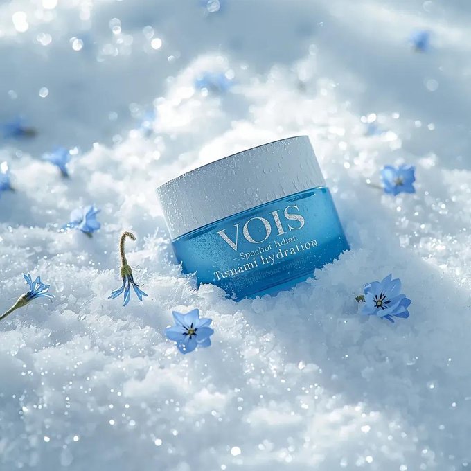 拍摄一款高端护肤品产品照片,画面中一罐贴有“VOIS – 海啸保湿”标签的蓝色面霜斜置于部分积雪之中。罐身覆盖着一层薄薄的霜花和细小的凝结冰晶,凸显了冰爽保湿的概念。产品周围,点缀着几朵精致的蓝色报春花,绿叶环绕,自然散落在雪地上,有的半埋于雪中,有的则静静地躺在雪面上。雪质柔软细腻,闪烁的冰晶在阳光下熠熠生辉。明亮的冬日阳光从侧面照射进来,营造出清晰的微对比度,霜花和雪晶闪耀着高光,罐身和花朵周围则投射出柔和的自然阴影。背景简洁干净,柔和的雪景散景营造出清冷空灵的氛围。采用电影般的微距构图,产品清晰锐利,周围环境则柔和虚化。高端商业护肤品广告风格,85mm 微距镜头,f/2.8 光圈,ISO 100,浅景深,超细纹理,照片级真实感,8K 分辨率,无文字叠加,无人,极简干净背景。